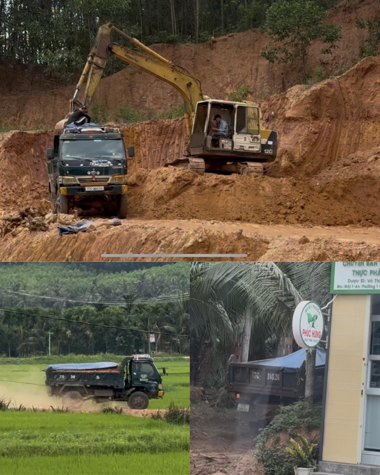 Xe tải mang biển số 77C-24024 đang được xe máy múc xúc đất lên thùng xe ngay giữa khu vực đồi đất đã bị đào xới nham nhở. Ảnh: BT