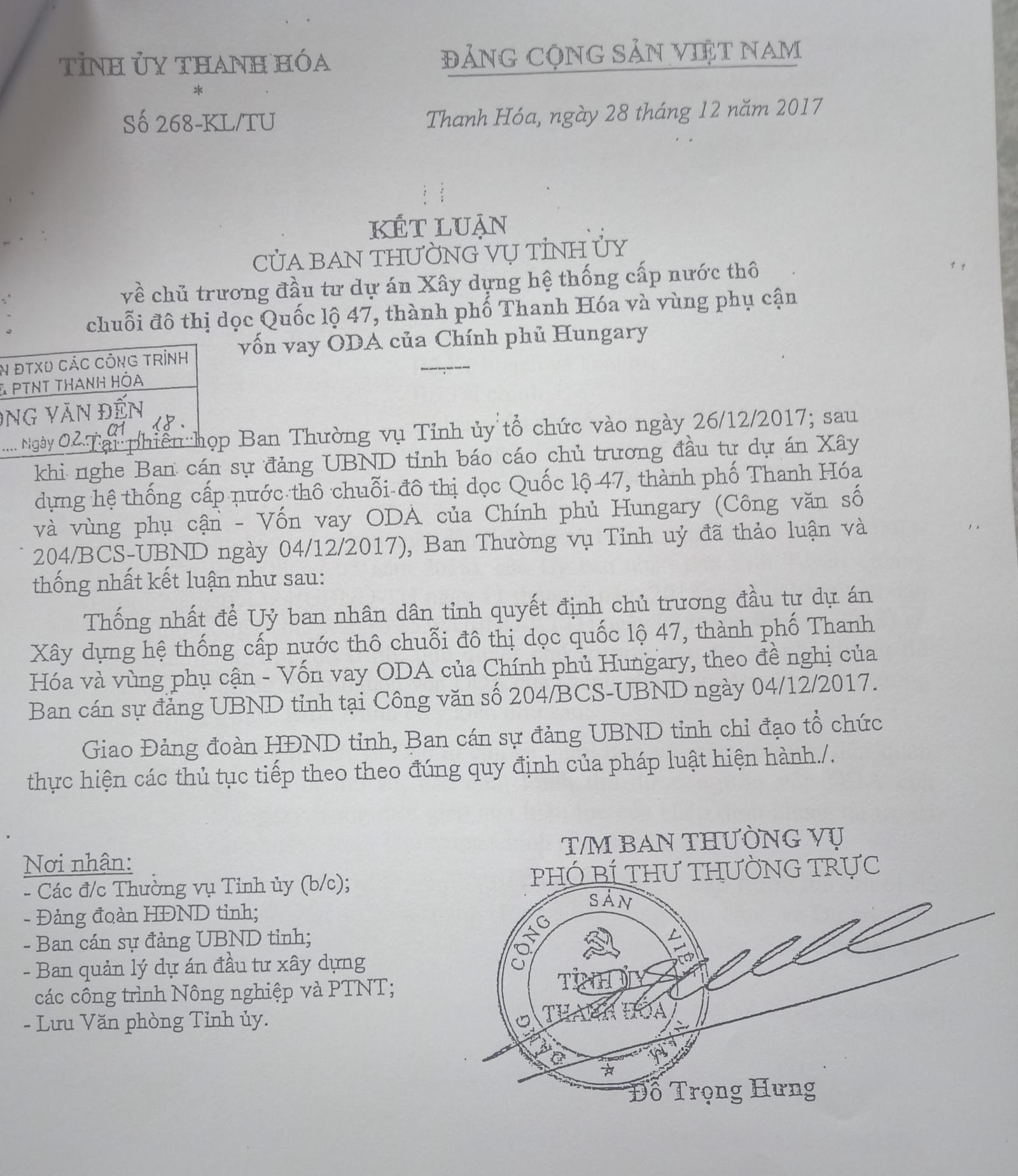 Kết luận của Ban Thường vụ Tỉnh ủy Thanh Hóa thống nhất chủ trương đầu tư dự án bằng nguồn vốn vay Hungary. Ảnh: VT