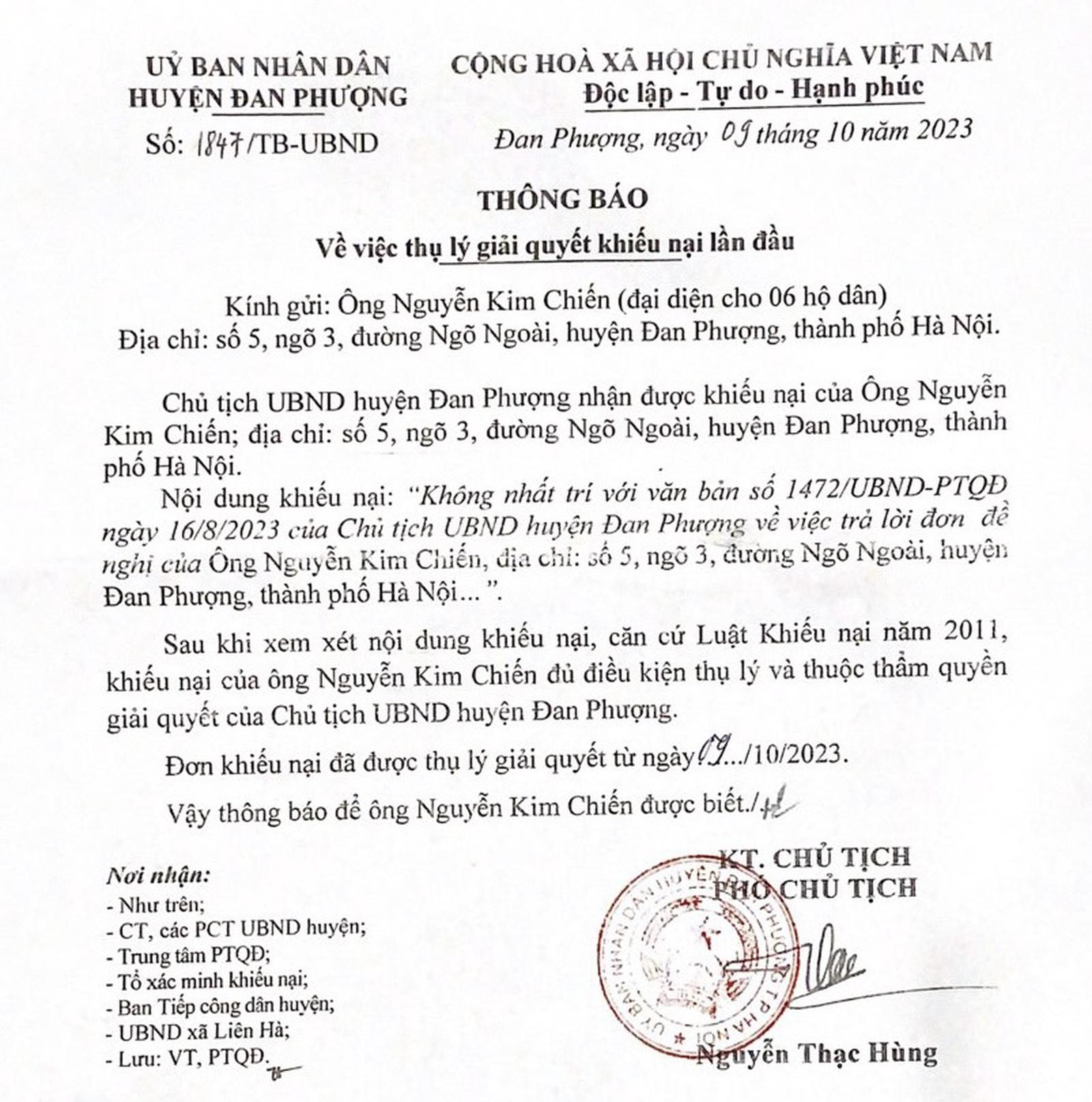 Thông báo số 1847/TB-UBND ngày 09/10/2023 của UBND huyện Đan Phượng về việc thụ lý giải quyết khiếu nại lần đầu. Ảnh: TQ