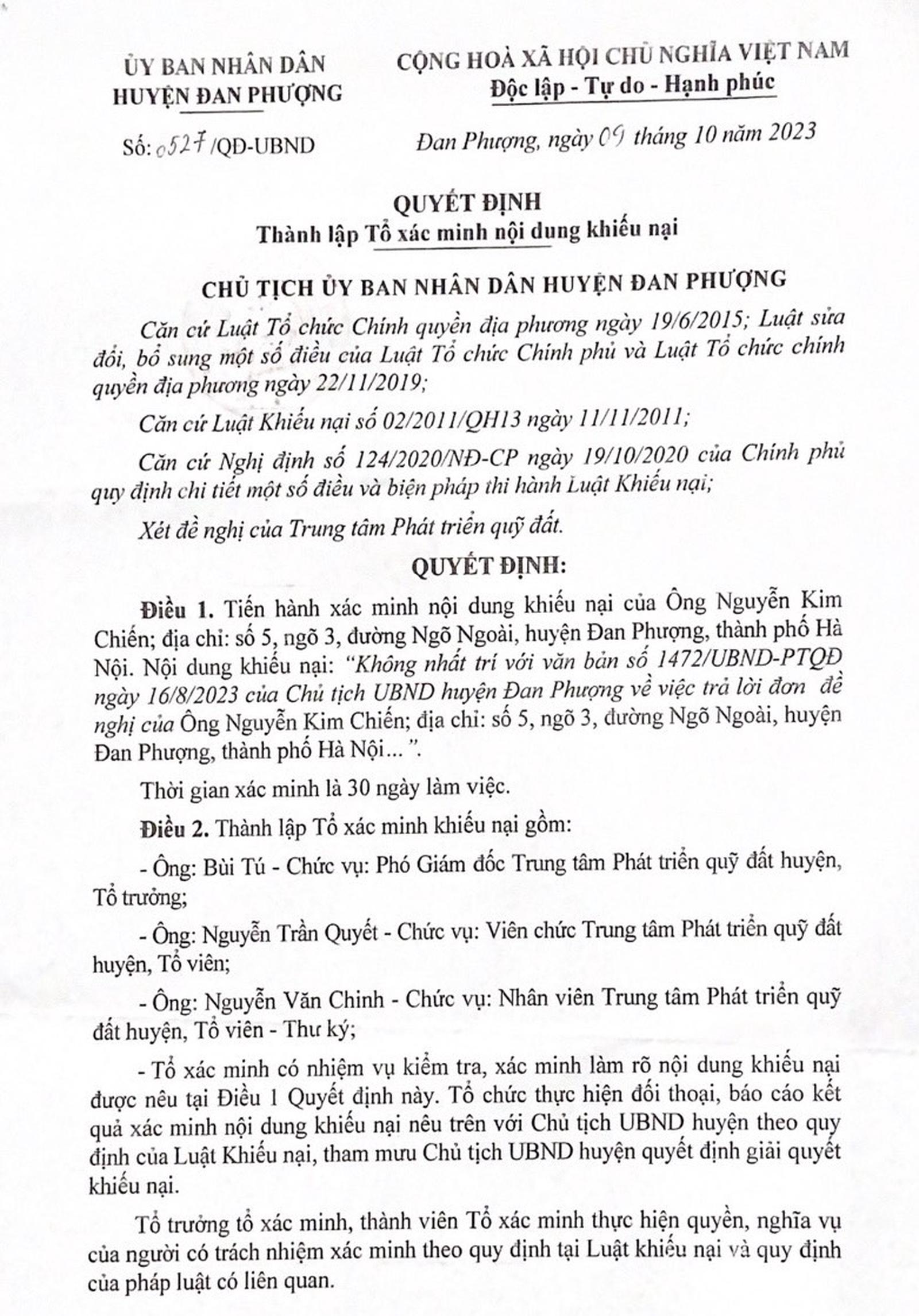 Ngày 9/10/2023, UBND huyện Đan Phượng đã ban hành Quyết định số 6527/QĐ-UBND về việc thành lập tổ xác minh nội dung khiếu nại của ông Nguyễn Kim Chiến. Nội dung khiếu nại “không nhất trí với Văn bản số 1472/UBND-PTQĐ ngày 16/8/2023 của UBND huyện Đan Phượng về việc trả lời đơn đề nghị của ông Nguyễn Kim Chiến”. Tổ xác minh gồm 03 thành viên do ông Bùi Tú, Phó Giám đốc TTPTQĐ huyện làm Tổ trưởng. Thời gian xác minh là 30 ngày làm việc.