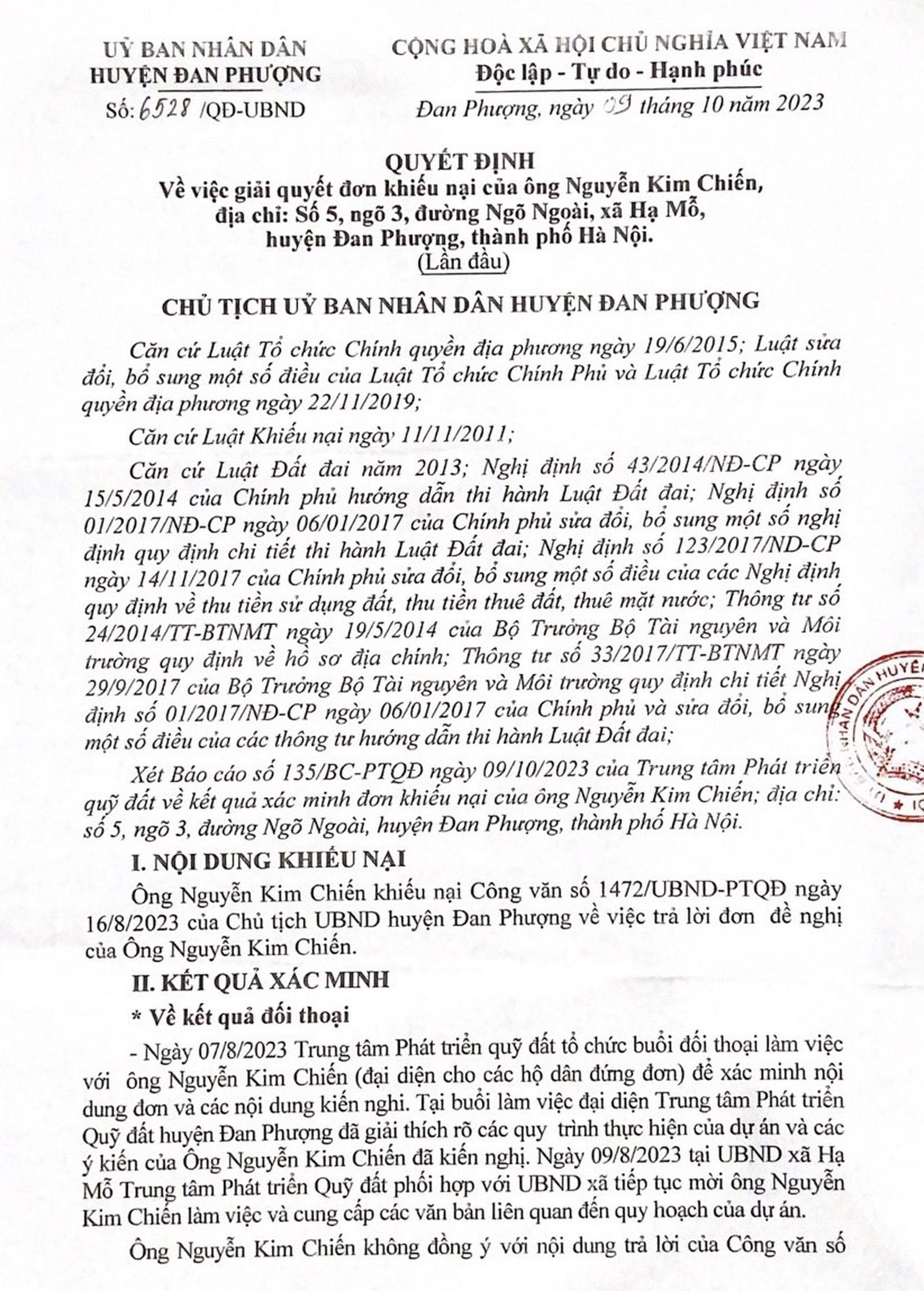 Cùng ngày 9/10/2023, UBND huyện Đan Phượng ban hành Quyết định số 6528/QĐ-UBND về việc giải quyết đơn khiếu nại (lần đầu) của ông Nguyễn Kim Chiến, địa chỉ số 5, ngõ 3, đường Ngõ Ngoài, xã Hạ Mỗ. Quyết định số 6528/QĐ-UBND, UBND huyện Đan Phượng căn cứ Báo cáo số 135/BC-PTQĐ ngày 9/10/2023 của TTPTQĐ về kết quả xác minh đơn khiếu nại của ông Nguyễn Kim Chiến mà không phải báo cáo của tổ xác minh theo Quyết định số 6527/QĐ-UBND ngày 9/10/2023.