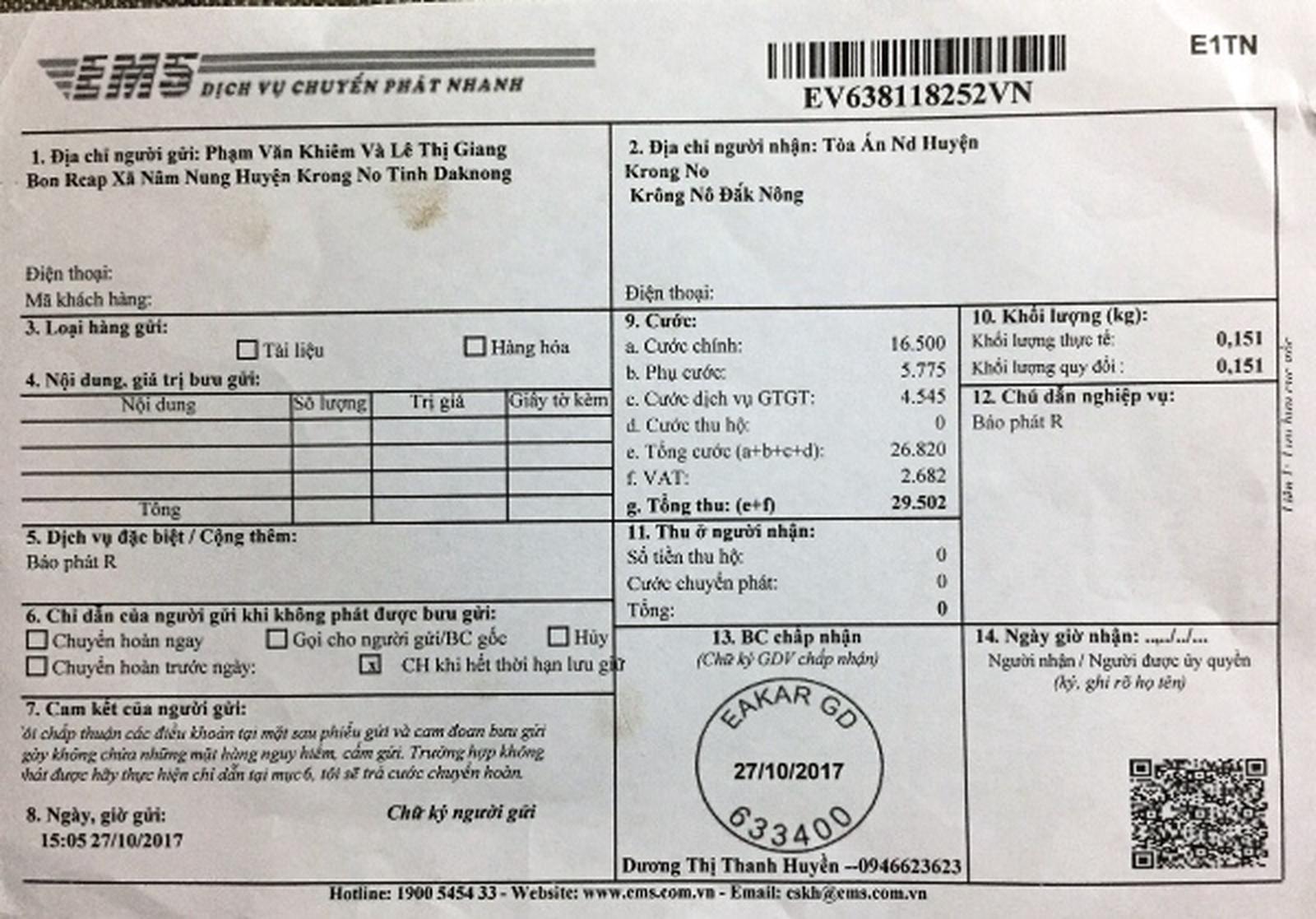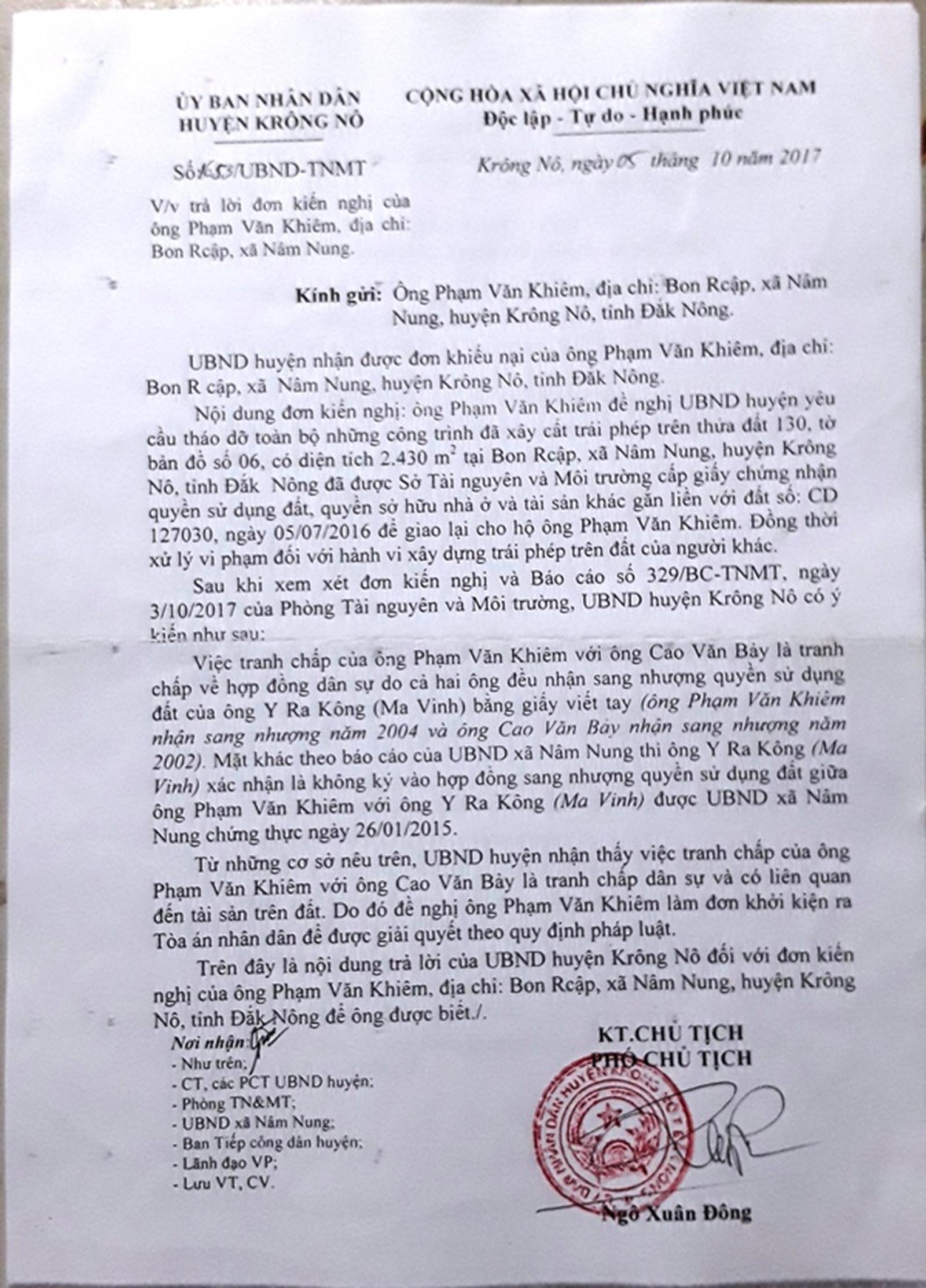 Ngày 5/10/2017, UBND huyện Krông Nô có Công văn số 1653/UBND – TNMT hướng dẫn ông Khiêm và bà Giang làm đơn khởi kiện đến TAND để giải quyết theo quy định của pháp luật. Theo đó, từ ngày 27/10/2017 đến nay, gia đình ông Khiêm và bà Giang đã ba lần gửi đơn khởi kiện (qua bưu điện và trực tiếp nộp tại Tòa án) yêu cầu TAND huyện Krông Nô xem xét, giải quyết: Buộc ông Cao Văn Bảy tháo dỡ toàn bộ những công trình đã xây cất trái phép trên thửa đất số 130, tờ bản đồ số 6 có diện tích 2.430m2 đất tại xã Nâm Nung, giao lại đất cho gia đình ông Khiêm, bà Giang theo quy định của pháp luật. Thế nhưng cho đến nay TAND huyện Krông Nô vẫn chưa thụ lý, giải quyết.