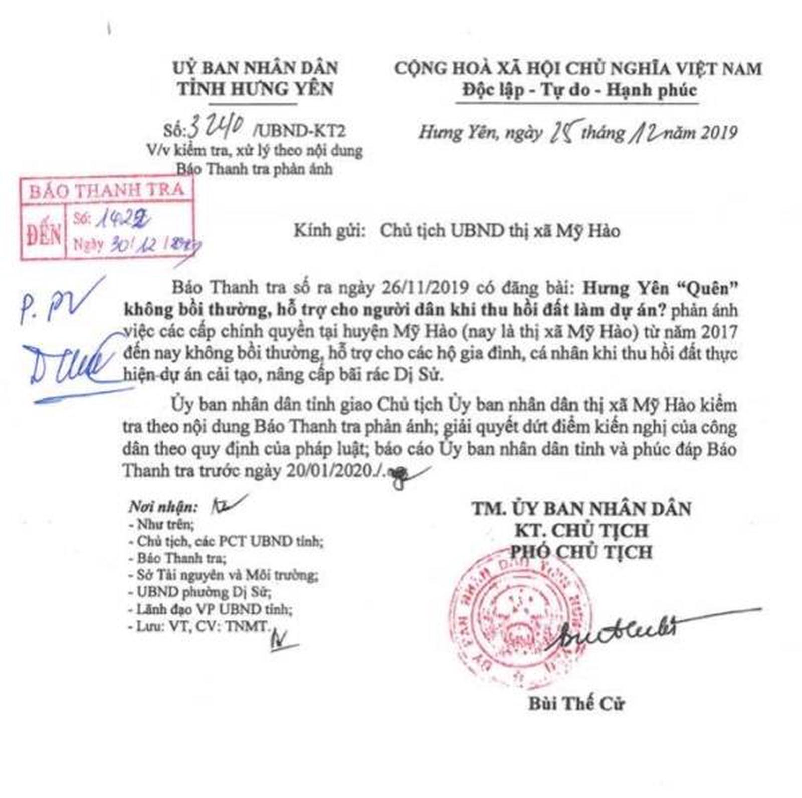 “UBND tỉnh giao Chủ tịch UBND thị xã Mỹ Hào kiểm tra theo nội dung Báo Thanh tra phản ánh; giải quyết dứt điểm kiến nghị của công dân theo quy định của pháp luật; báo cáo UBND tỉnh và phúc đáp Báo Thanh tra trước ngày 20/1/2020”- văn bản nêu.