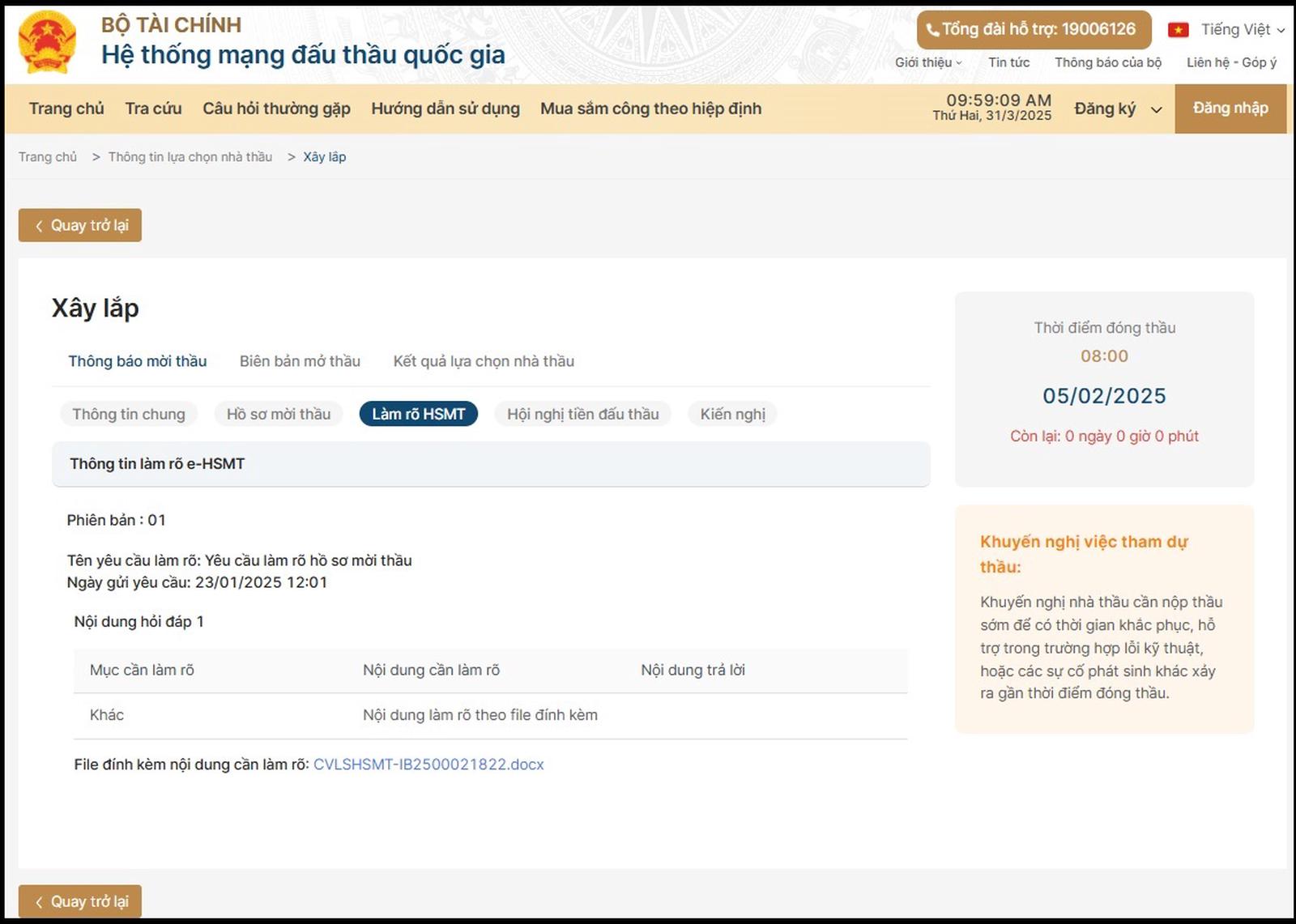 Ngày 23/1/2025, Công ty NHB có yêu cầu làm rõ E-HSMT gửi lên hệ thống mạng đấu thầu quốc gia, nhưng đến nay, chủ đầu tư, bên mời thầu cũng chưa có phản hồi mặc dù đã có kết quả lựa chọn nhà thầu. Ảnh chụp màn hình ngày 31/3/2025: N.H