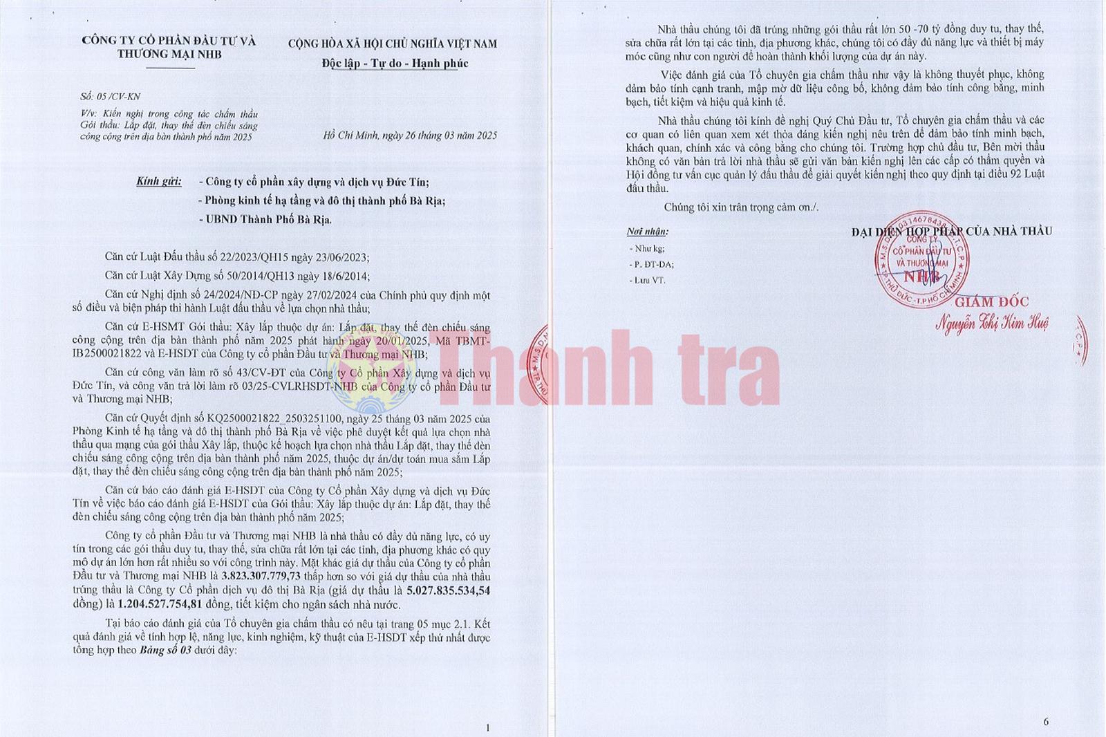 Sau khi kết quả đánh giá E-HSDT được công khai, nhận thấy quyền và lợi ích hợp pháp của mình bị ảnh hưởng, Công ty NHB đã có đơn kiến nghị gửi chủ đầu tư và bên mời thầu để đề nghị xem xét lại kết quả lựa chọn nhà thầu theo khoản 1, Điều 89 Luật Đấu thầu 2023.