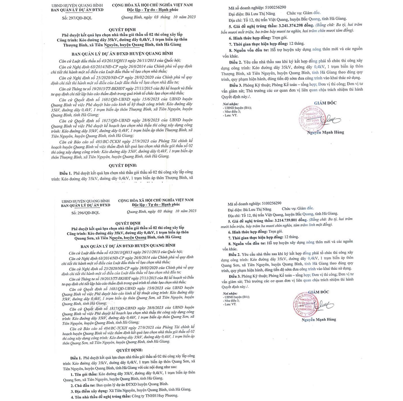 Riêng ngày 3/10/2023, Giám đốc BQL DA Đầu tư Xây dựng huyện Quang Bình đã ký 2 quyết định phê duyệt kết quả lựa chọn nhà thầu đối với Công ty TNHH Huy Phương trúng 2 gói thầu với tổng giá trị gần 7 tỷ đồng.