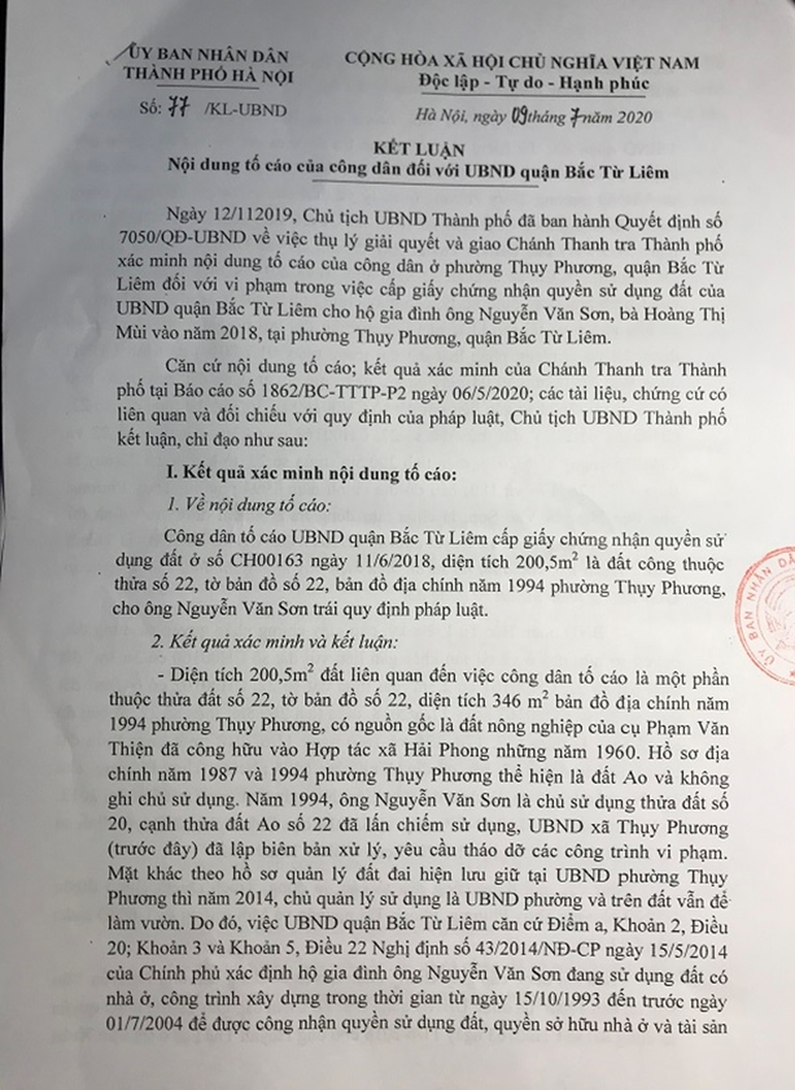 Đối với Kết luận số 77/KL-UBND ngày 09/7/2020 của UBND TP Hà Nội (kết luận nội dung tố cáo đối với việc UBND quận Bắc Từ Liêm cấp GCN cho mảnh đất năm 2010 đã được báo cáo trước HĐND xã Thụy Phương là đất công và đã bị cưỡng chế, dự kiến xây công trình công cộng - PV), UBND quận Bắc Từ Liêm đã ban hành Văn bản số 2050/UBND-TTr ngày 15/7/2020 chỉ đạo các đơn vị có liên quan tổ chức kiểm điểm; chỉ đạo Phòng Nội vụ triển khai Văn bản số 337/NV ngày 15/7/2020 hướng dẫn Phòng TNMT, phường Thụy Phương tổ chức kiểm điểm. Kết quả như sau: