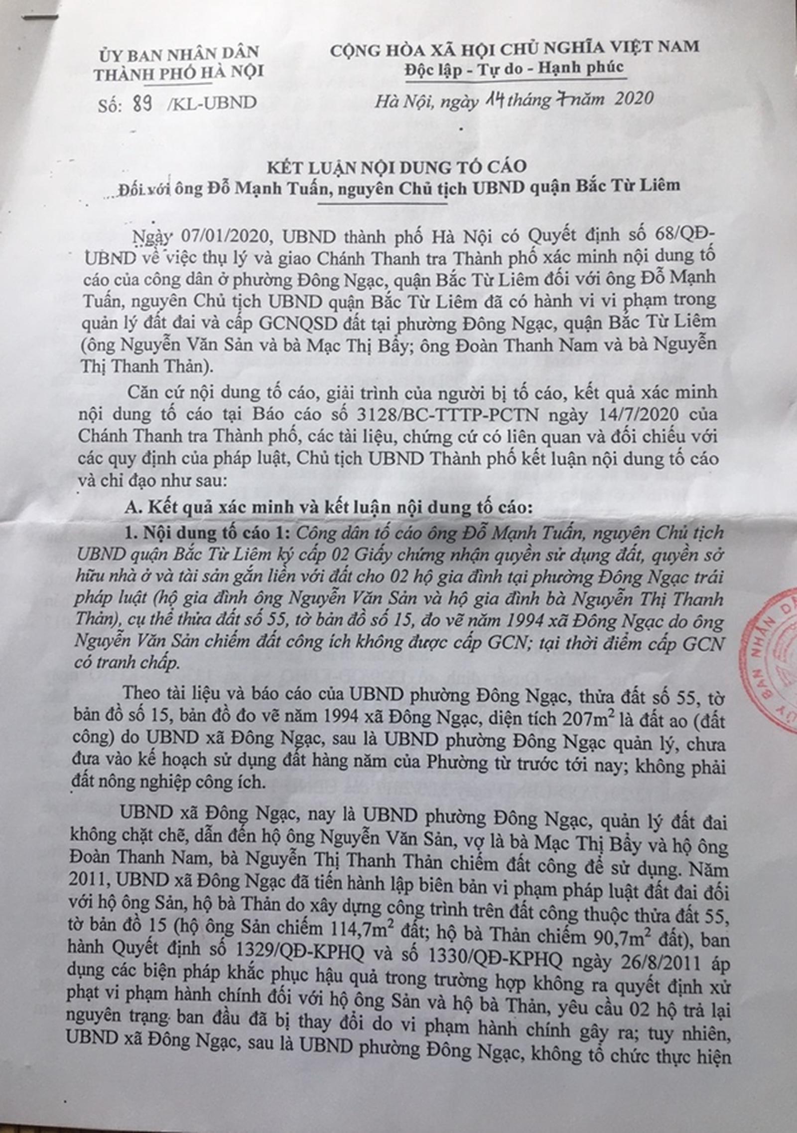 Báo cáo ngày 17/12/2020 của Chủ tịch UBND quận Bắc Từ Liêm cho biết: Sau kết luận 89/KL-UBND ngày 14/7/2020 của UBND TP Hà Nội (kết luận nội dung công dân tố cáo ông Đỗ Mạnh Tuấn kí cấp 02 giấy chứng nhận quyền sử dụng đất (GCNQSDĐ), quyền sở hữu nhà ở và tài sản gắn liền với đất cho 02 hộ gia đình tại phường Đông Ngạc trái pháp luật - PV), UBND quận Bắc Từ Liêm đã ban hành Văn bản số 2048/UBND-TTr ngày 15/7/2020 chỉ đạo các đơn vị có liên quan tổ chức kiểm điểm; chỉ đạo Phòng Nội Vụ ban hành văn bản hướng dẫn các phòng: Tài nguyên và Môi trường (TNMT), Thanh tra, Tư pháp quận, UBND phường Đông Ngạc, UBND phường Đức Thắng tổ chức kiểm điểm đối với các cá nhân liên quan; ban hành Thông báo số 1287/TB-UBND ngày 07/9/2020 về việc rút kinh nghiệm đối với ông Đỗ Mạnh Tuấn - nguyên Chủ tịch UBND quận Bắc Từ Liêm; Công văn số 2720/UBND-NV ngày 15/9/2020 báo cáo Ban Thường vụ Quận ủy chỉ đạo kiểm điểm trách nhiệm đối với ông Nguyễn Văn An - Bí thư Đảng ủy phường Đông Ngạc.