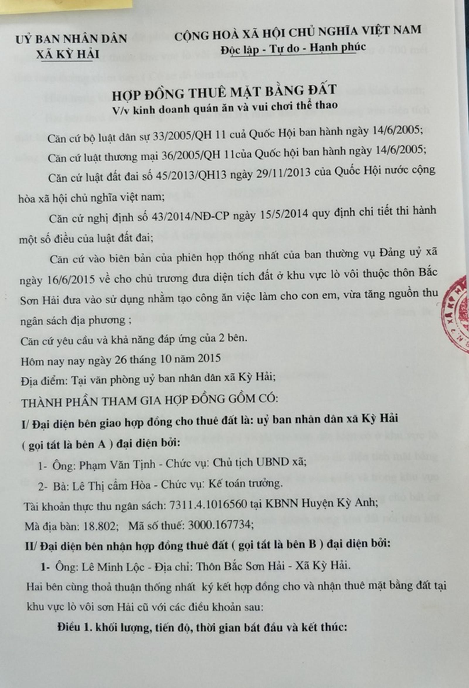 Không chỉ có ông Võ Đức Dũng được thuê đất trái thẩm quyền, mà ngày 26/10/2015, UBND xã Kỳ Hải đã ký một bản hợp đồng cho thuê đất trái luật để làm quán ăn và khu vui chơi thể thao. Theo đó, đại diện bên cho thuê đất là ông Phạm Văn Tịnh, Chủ tịch UBND xã và bà Lê Thị Cẩm Hòa, Kế toán trưởng. Còn đại diện bên nhận hợp đồng cho thuê đất là ông Lê Minh Lộc có địa chỉ tại thôn Bắc Sơn Hải, xã Kỳ Hải. Thời gian thực hiện hợp đồng từ ngày 26/10/2015 - 31/12/2020. Tổng số tiền ông Lê Minh Lộc phải nộp theo hợp đồng là 40 triệu đồng.