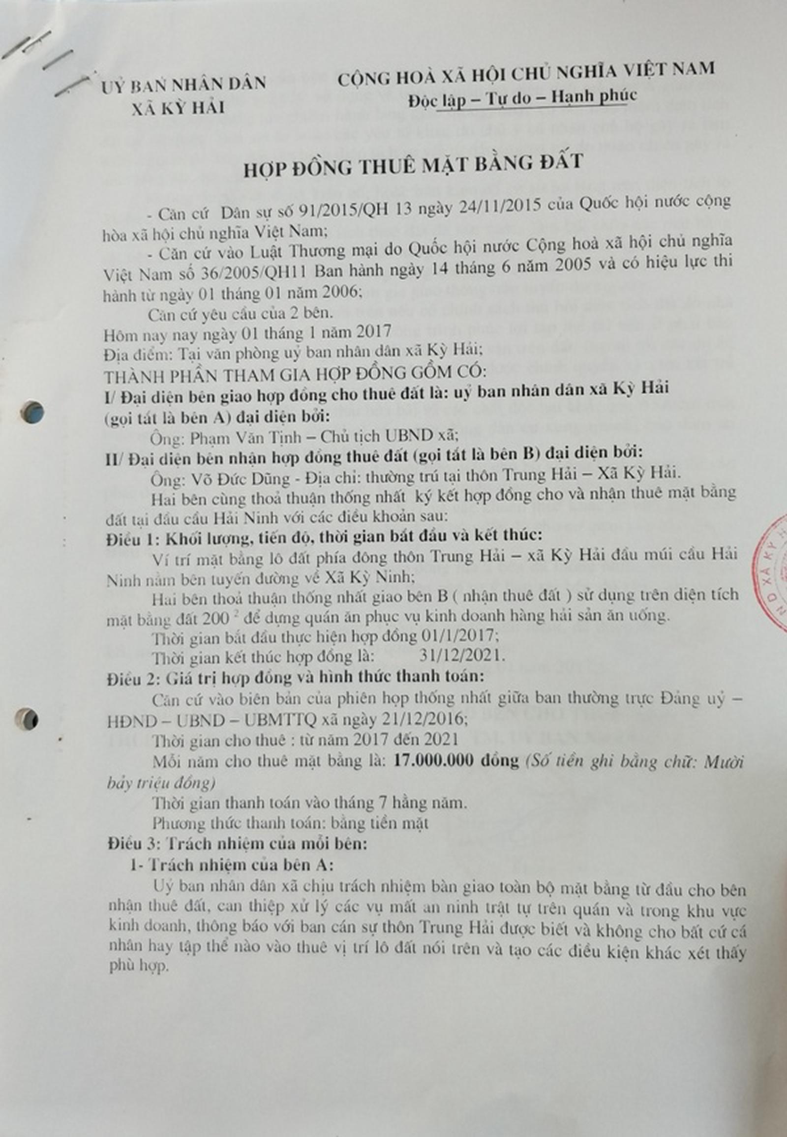 Ngày 2/8/2011, hợp đồng thuê mặt bằng đất đã được lãnh đạo xã này ký với ông Võ Đức Dũng với cam kết không cho bất cứ cá nhân hay tập thể nào vào thuê lô đất nói trên... ngoài ông Dũng. Thời gian thực hiện hợp đồng từ năm 2012 đến năm 2016. Ông Võ Đức Dũng phải nộp số tiền cho xã Kỳ Hải là 62 triệu đồng.