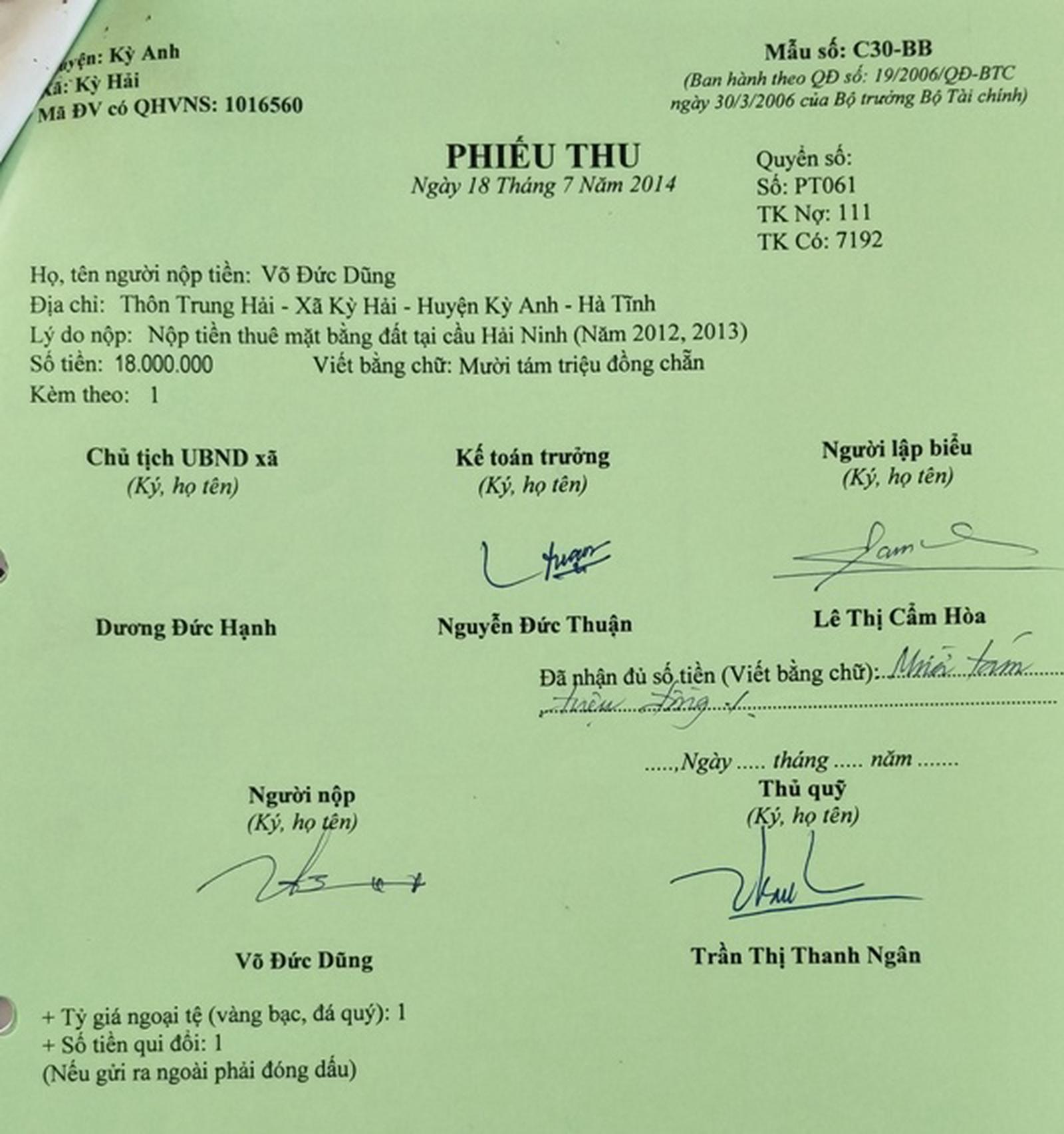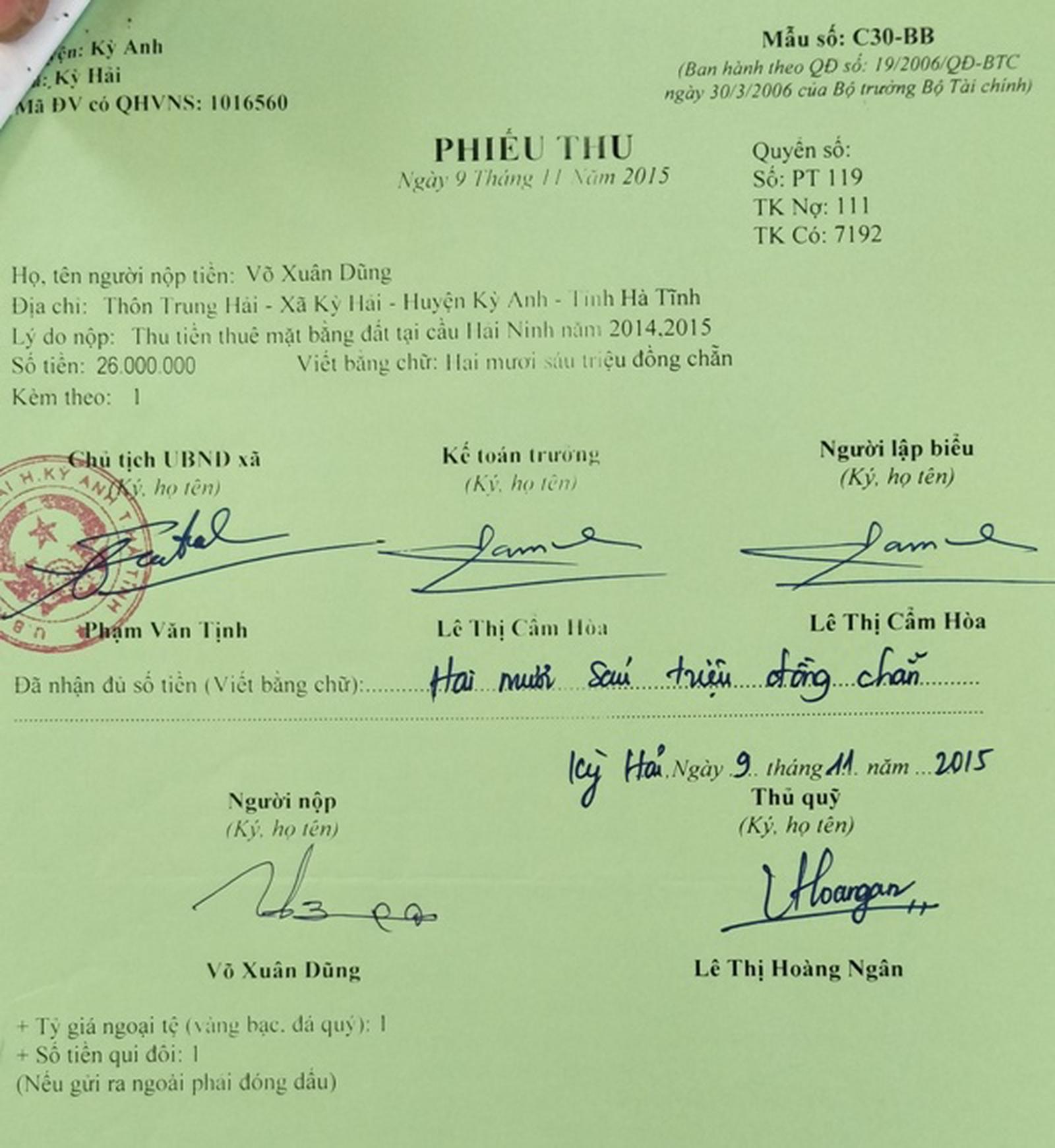 Phiếu thu tiền cho thuê đất trái thẩm quyền của UBND xã Kỳ Hải. Ảnh: TT