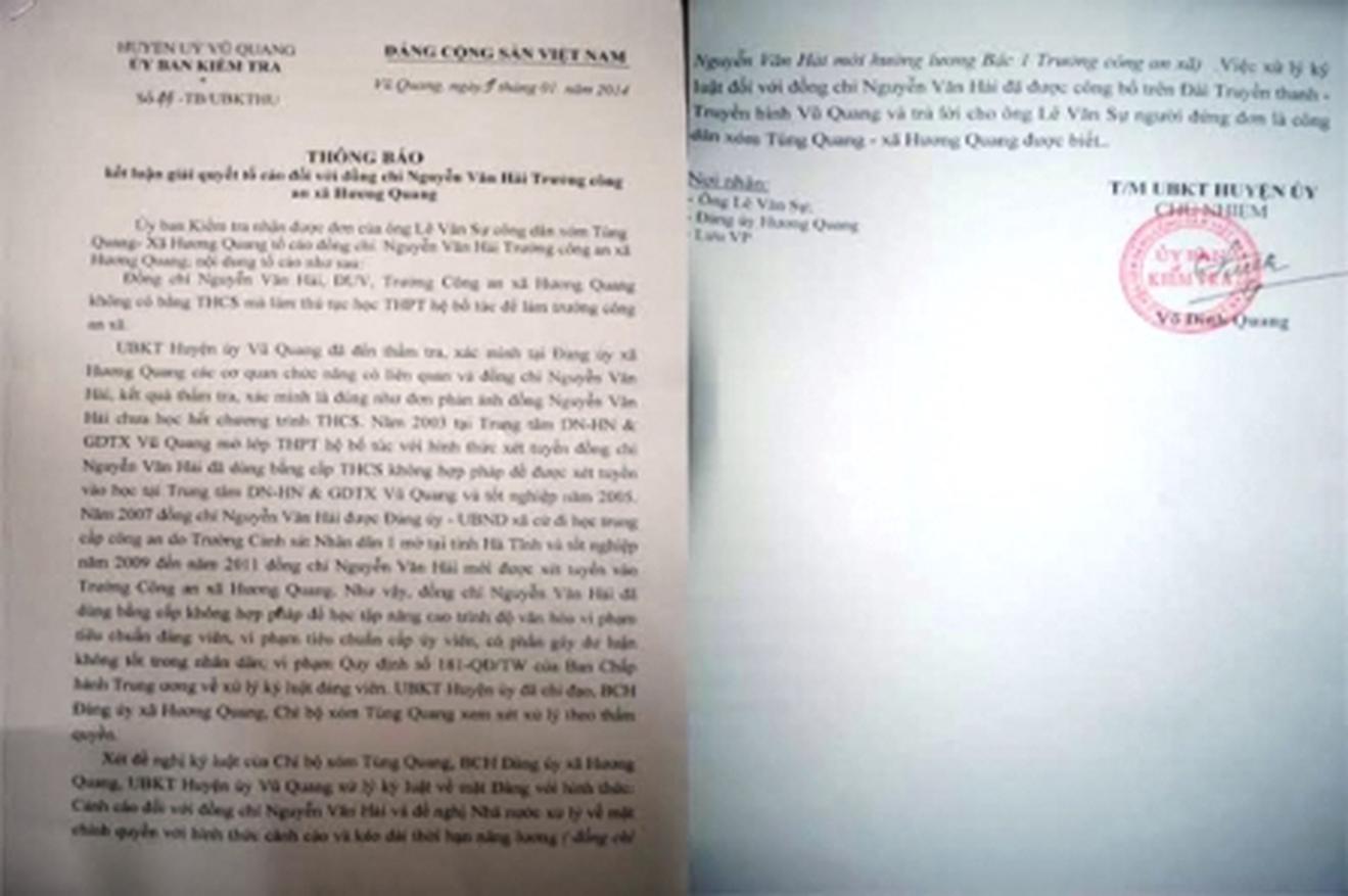Theo thông báo kết quả xác minh và kết luận của Ủy ban Kiểm tra Huyện ủy Vũ Quang số 99/TB-UBKTHU ngày 9/1/2014, ông Nguyễn Văn Hải (SN 1975) ở xã Hương Quang chưa học hết THCS. Tuy nhiên, vào năm 2003, ông đã dùng bằng giả được xét tuyển vào học THPT (hệ bổ túc) để chuẩn hóa trình độ theo quy định, khai man hồ sơ lý lịch Đảng.