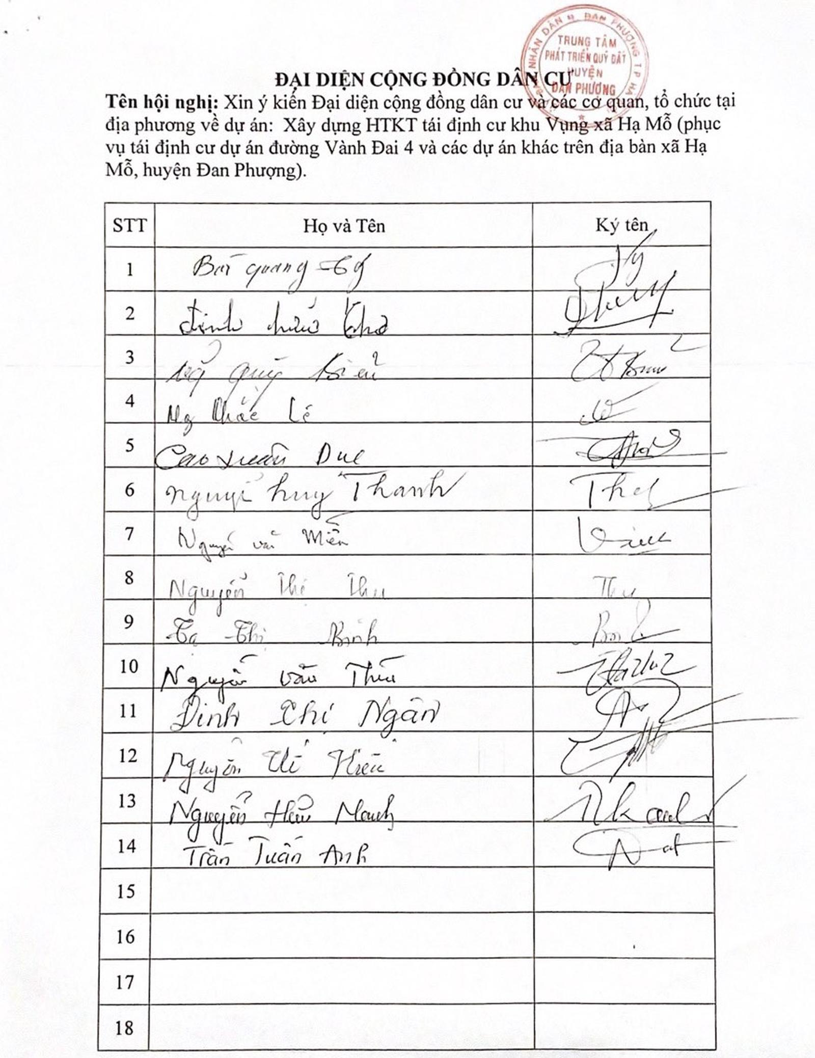 “Sau một thời gian dài người dân đề nghị, ngày 12/9/2023, Trung tâm Phát triển quỹ đất huyện Đan Phượng mới cung cấp biên bản họp lấy ý kiến cộng đồng dân cư dự án xây dựng hạ tầng kỹ thuật tái định cư khu Vụng, xã Hạ Mỗ phục vụ tái định cư đường Vành đai 4 và các dự án khác trên địa bàn xã Hạ Mỗ, huyện Đan Phượng, đề ngày 6/9/2022. Tuy nhiên, có hai đơn vị có tham dự cuộc họp gồm Phòng Tài nguyên và Môi trường và Phòng Quản lý đô thị lại không ký và đóng dấu vào biên bản. Danh sách tham dự cuộc họp gồm 14 người đều là đại diện ban mặt trận thôn; trưởng, phó thôn; bí thư, phó bí thư chi bộ thôn… mà không có bất cứ người dân nào tham dự cuộc họp này, kể cả các hộ dân trong diện phải thu hồi đất cho dự án” - ông Chiến cho biết.