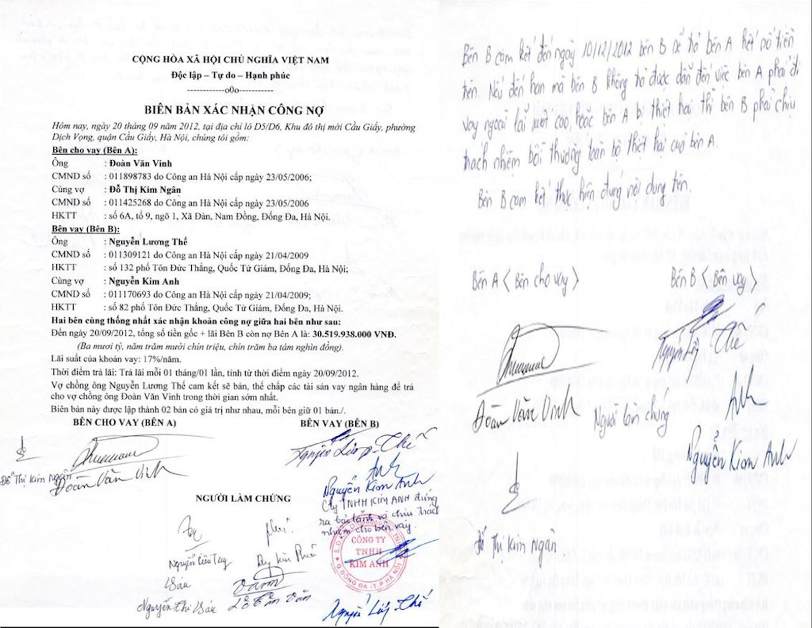 Tại phiên tòa phúc thẩm, ông Vinh đã đưa ra rất nhiều chứng cứ là các biên bản nhận nợ có xác nhận chữ ký từng trang của ông Thế, bà Kim Anh và 6 người làm chứng. Vậy nhưng ông Thế vẫn cho rằng bản thân không “nợ đồng nào” gia đình ông Vinh.
