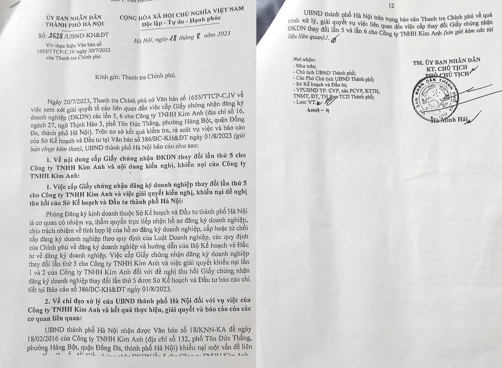 Điều này được thể hiện rõ tại Văn bản số 2628/UBND-KH&ĐT ngày 18/8/2023 của UBND TP Hà Nội báo cáo Thanh tra Chính phủ do trước đó vợ chồng ông Thế đã có đơn gửi tới cơ quan này và Ban Nội chính Trung ương. Theo đó, đối với kiến nghị, khiếu nại của vợ chồng ông Thế về việc thu hồi GCNĐKDN lần thứ 5 của Công ty Kim Anh và loại bỏ tên ông Đoàn Minh Quân, UBND TP Hà Nội cho rằng: Các cơ quan liên quan như Công an TP Hà Nội, Thanh tra thành phố, UBND TP, Bộ Công an, Bộ Kế hoạch và Đầu tư, Bộ Nội vụ, Bộ Tư pháp đã cùng phối hợp, hỗ trợ xem xét, xác minh, đưa ra ý kiến đánh giá, đề xuất giải quyết với UBND Thành phố và Thủ tướng Chính phủ. Tại Văn bản số 12906/VPCP ngày 01/11/2017 của Văn phòng Chính phủ, Phó Thủ tướng Thường trực Chính phủ đã có ý kiến kết luận: "Việc cấp Giấy chứng nhận ĐKDN thay đổi lần 5 ngày 31/10/2012 của Phòng Đăng ký kinh doanh - Sở KH&ĐT thành phố Hà Nội cho Công ty TNHH Kim Anh là đúng quy định pháp luật". Như vậy, GCNĐKDN được cấp đúng quy định pháp luật thì không có căn cứ, lý do để thực hiện thu hồi.