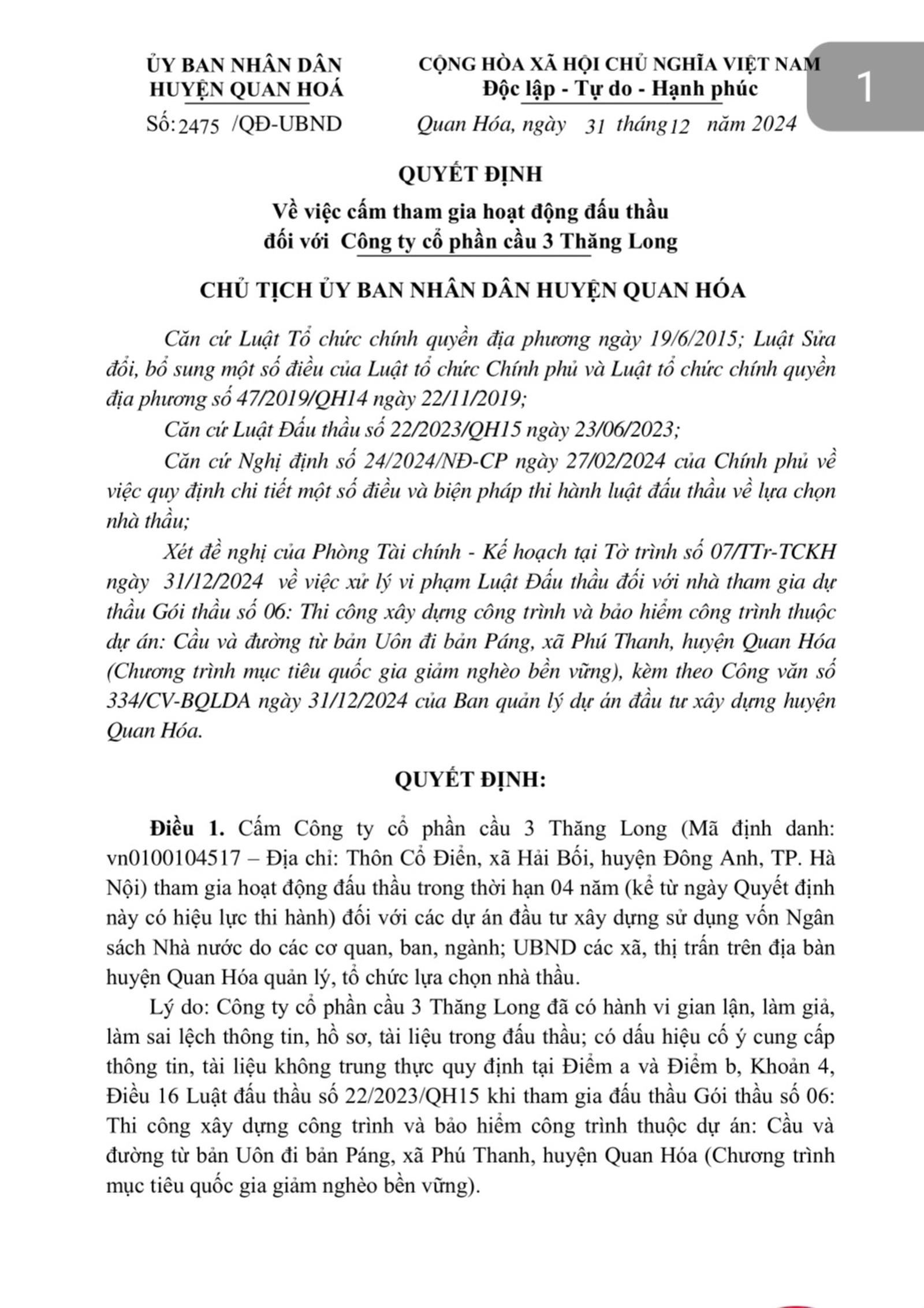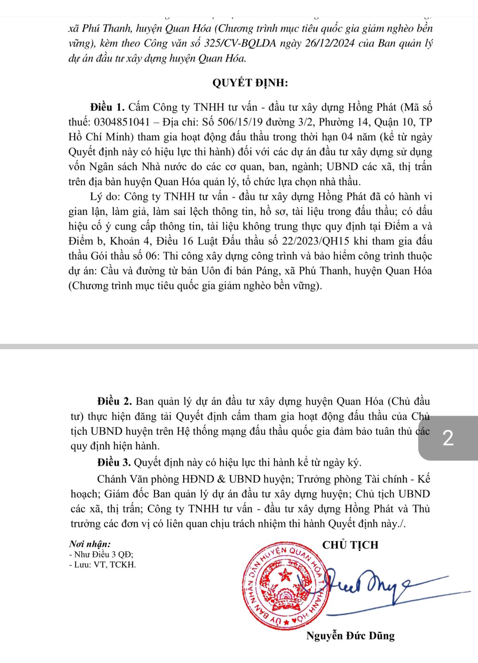 Ngoài Công ty Hồng Phát, Chủ tịch UBND huyện Quan Hóa Nguyễn Đức Dũng còn có Quyết định 2474/QĐ-UBND cấm Công ty Cổ phần cầu 3 Thăng Long. Mã định danh vn0100104517, địa chỉ thôn Cổ Điển, xã Hải Bối, huyện Đông Anh, TP Hà Nội tham gia hoạt động đấu thầu trong thời hạn 4 năm kể từ ngày quyết định này có hiệu lực thi hành đối với các dự án đầu tư xây dựng sử dụng vốn ngân sách Nhà nước do các cơ quan, ban, ngành; UBND các xã, thị trấn trên địa bàn huyện Quan Hóa quản lý, tổ chức lựa chọn nhà thầu.