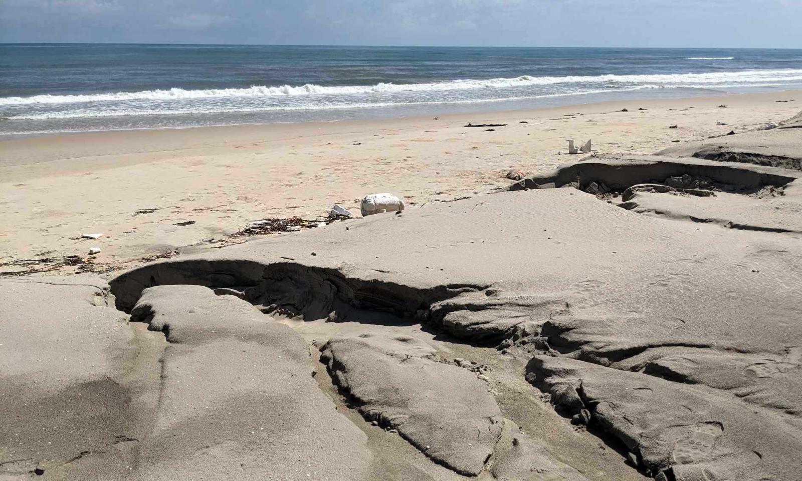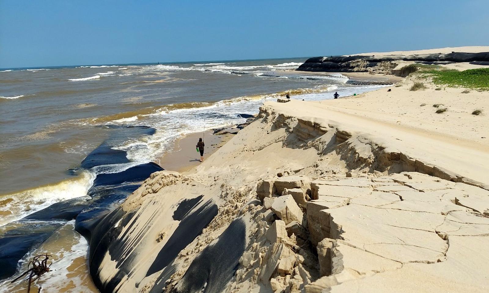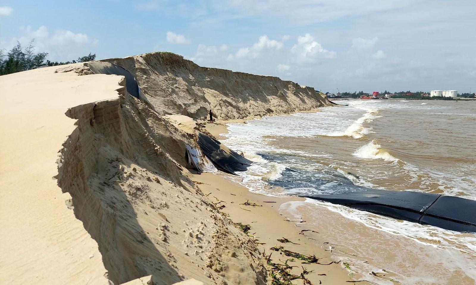Chưa kể, nhiều khu vực đê bao bằng ống địa kỹ thuật đã xuất hiện vết nứt lớn, tiềm ẩn nguy cơ tiếp tục sạt lở nếu không sớm có biện pháp xử lý. Trong khi đó, việc sạt lở gây bồi lấp khiến nước biển ăn sâu vào bãi tập kết. Sau mỗi cơn sóng lại cuốn một lượng lớn cát nạo vét ra biển trở lại.