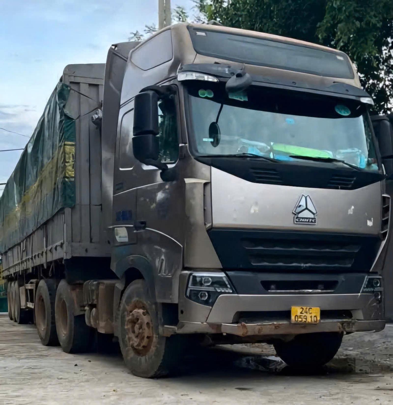 Xe ô tô đầu kéo mang biển kiểm soát 24C-05910, kéo rơ moóc mang biển kiểm soát 14R-01286, chở 34 cây gỗ giáng hương thuộc nhóm IIA còn nguyên gốc, rễ. Ảnh: HH