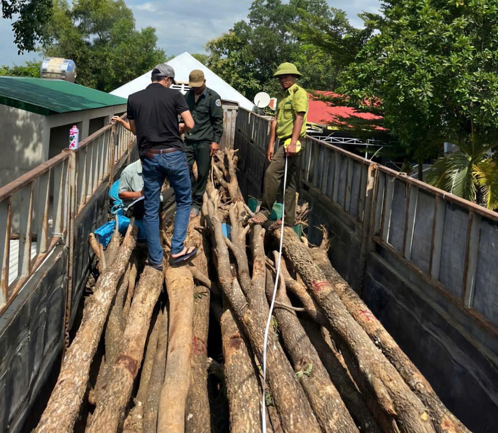 Kết quả, phát hiện 1 xe ô tô đầu kéo mang biển kiểm soát 24C-05910, kéo rơ moóc mang biển kiểm soát 14R-01286, bên trong thùng xe có 34 cây gỗ giáng hương còn nguyên gốc, rễ, do ông Phùng Văn Trực điều khiển.