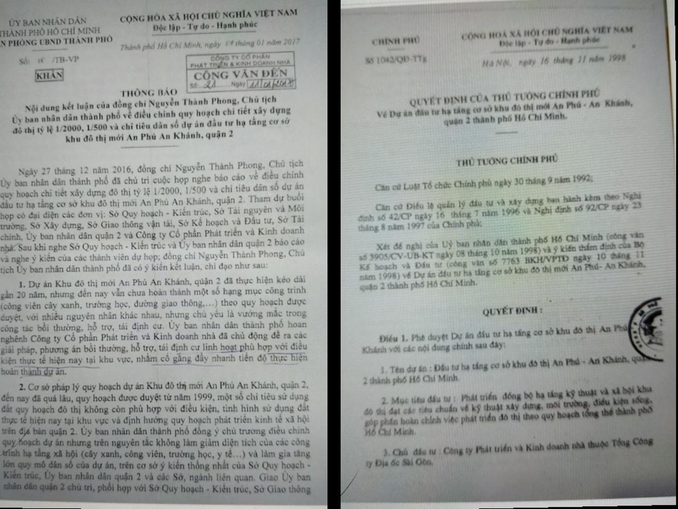 Quyết định số 1042/QD-TTg phê duyệt dự án của Thủ tướng và Thông báo 15/TB-VP của ông Nguyễn Thành Phong- Chủ tịch UBND TP HCM. Ảnh: NL