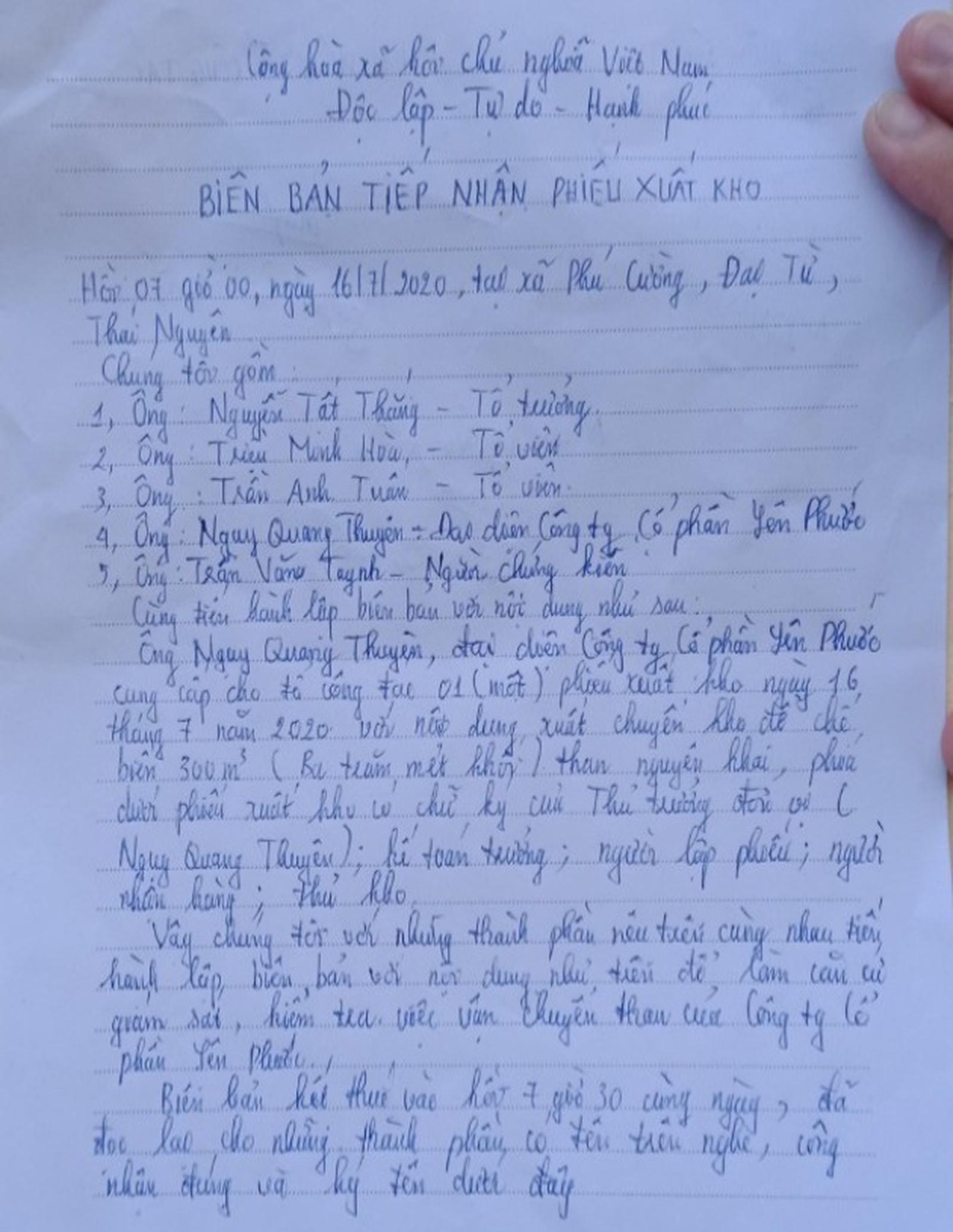 Biên bản tiếp nhận Phiếu xuất kho (viết tay đều đặn ngày 2 lần từ phía cơ quan chức năng). Ảnh: Nhóm PV