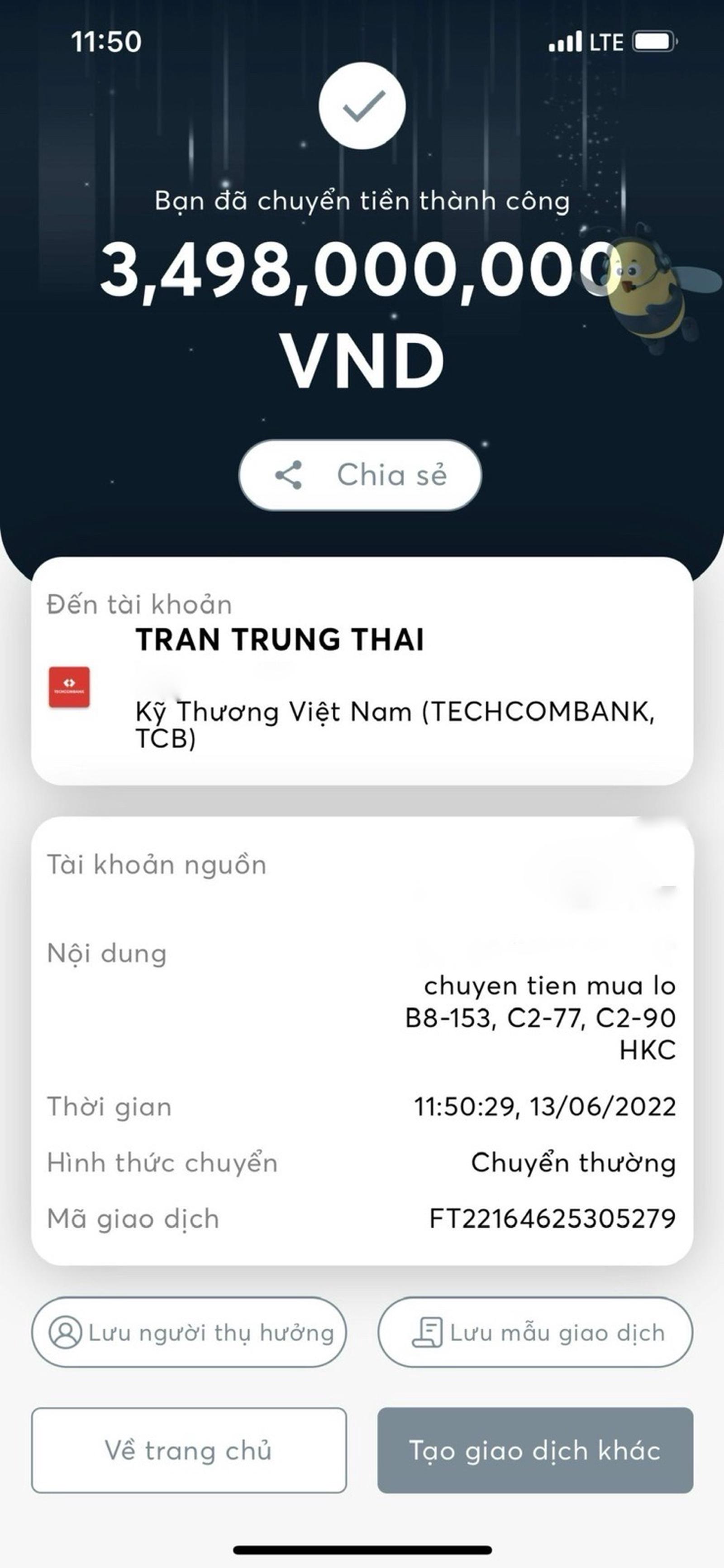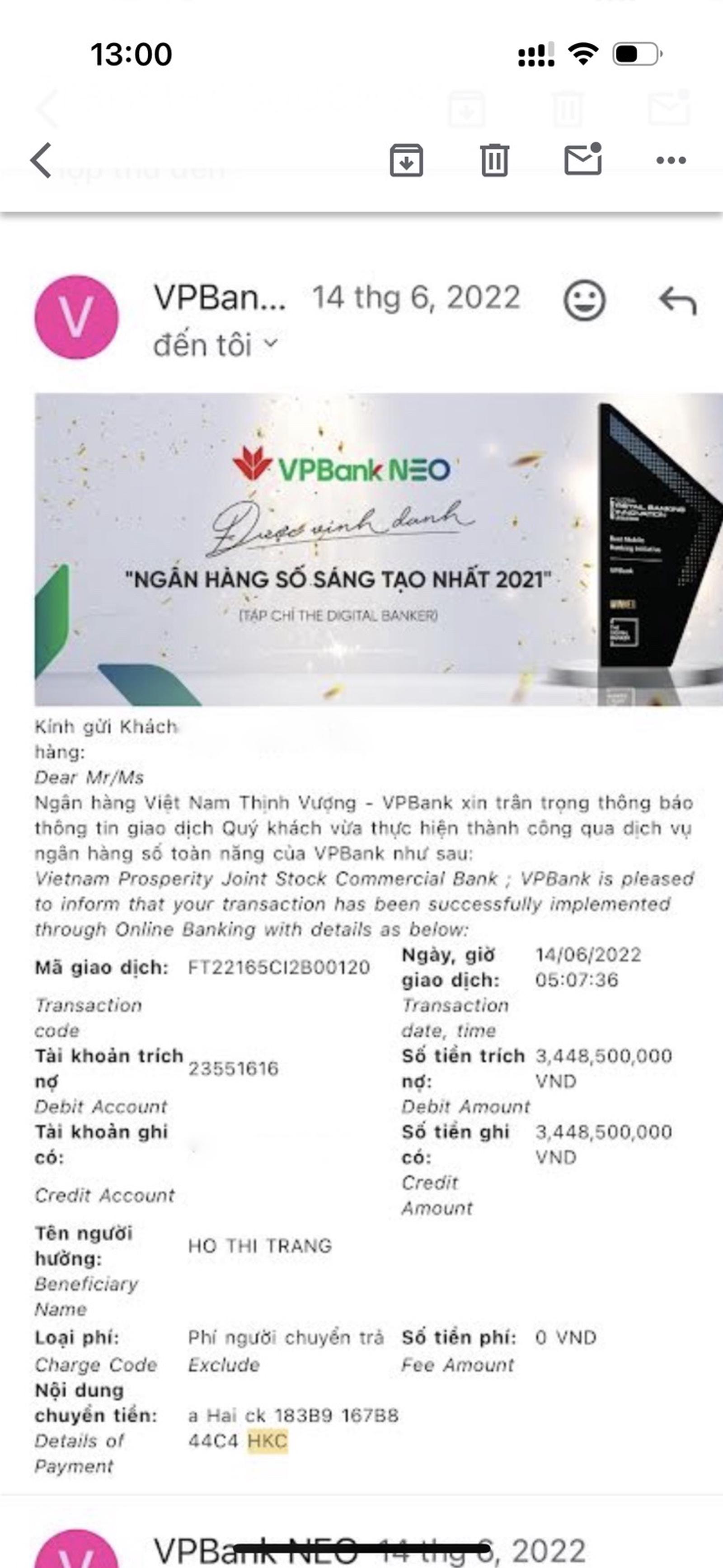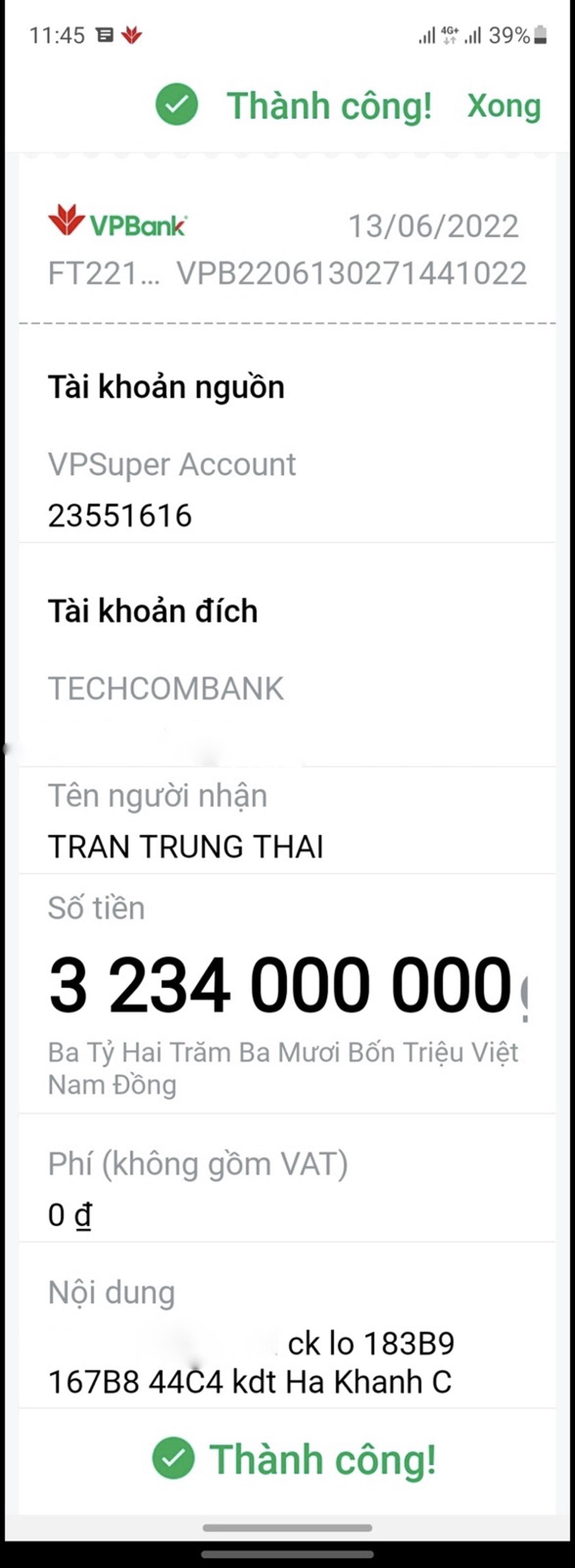Số tiền của ông P.Đ.T chuyển qua tài khoản của Bà Hồ Thị Trang 3,5 tỷ đồng. Số tiền gần 3,5 tỷ đồng còn lại được ông P.Đ.T chuyển trực tiếp vào tài khoản Phó Tổng giám đốc Hasco.