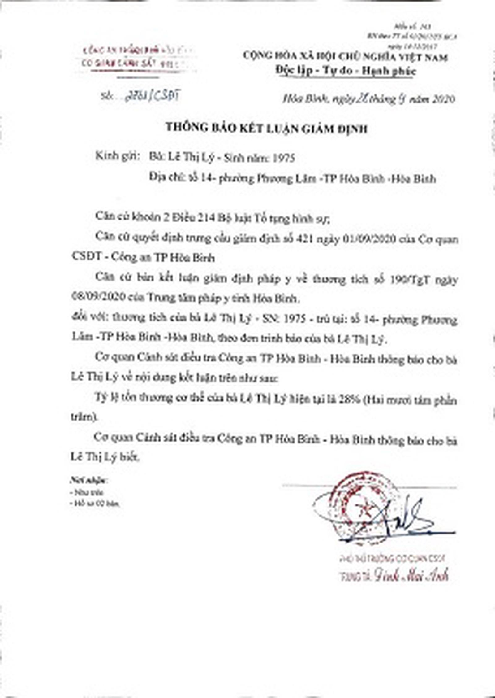 Thông báo kết luận giám định số 2761/CSĐT do Cơ quan Cảnh sát điều tra Công an TP Hòa Bình, tỉnh Hòa Bình cấp ngày 28/9/2020 xác định, bà Lê Thị Lý bị tổn thương cơ thể ở mức 28%.