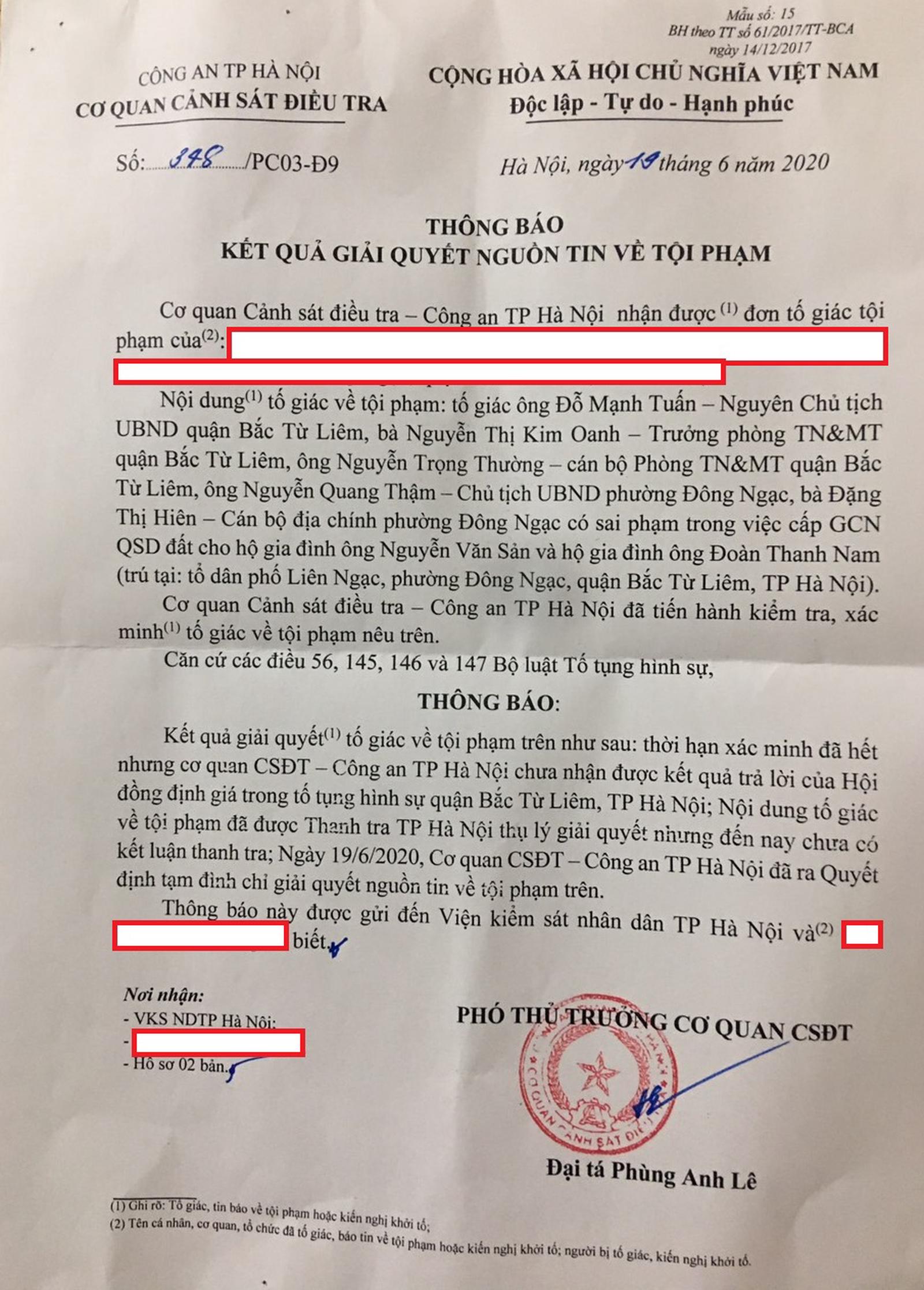 Ngày 19/6/2020, Phó Thủ trưởng Cơ quan CSĐT Công an Hà Nội đã kí Thông báo số 348/PC03-Đ9 thông báo kết quả giải quyết nguồn tin về tội phạm cho biết, Cơ quan CSĐT đã tiến hành xác minh về thông tin tố giác ông Đỗ Mạnh Tuấn - nguyên Chủ tịch UBND quận Bắc Từ Liêm, bà Nguyễn Thị Kim Oanh - Trưởng phòng Tài nguyên và Môi trường (TN&MT) quận Bắc Từ Liêm, ông Nguyễn Trọng Thường - cán bộ Phòng TN&MT quận Bắc Từ Liêm, ông Nguyễn Quang Thậm - Chủ tịch UBND phường Đông Ngạc, bà Đặng Thị Hiên - cán bộ địa chính phường Đông Ngạc có sai phạm trong việc cấp giấy chứng nhận quyền sử dụng đất cho hộ gia đình ông Nguyễn Văn Sản và hộ gia đình ông Đoàn Thanh Nam (trú tại tổ dân phố Liên Ngạc, quận Bắc Từ Liêm, Hà Nội).