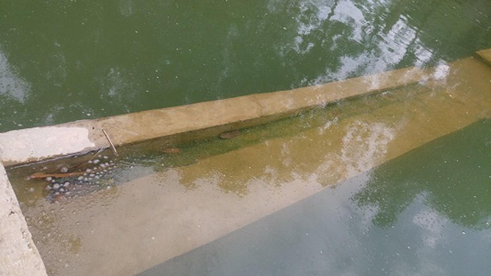 Nước trong bể màu xanh đục, có rác và đóng rêu xanh. Ảnh: TH