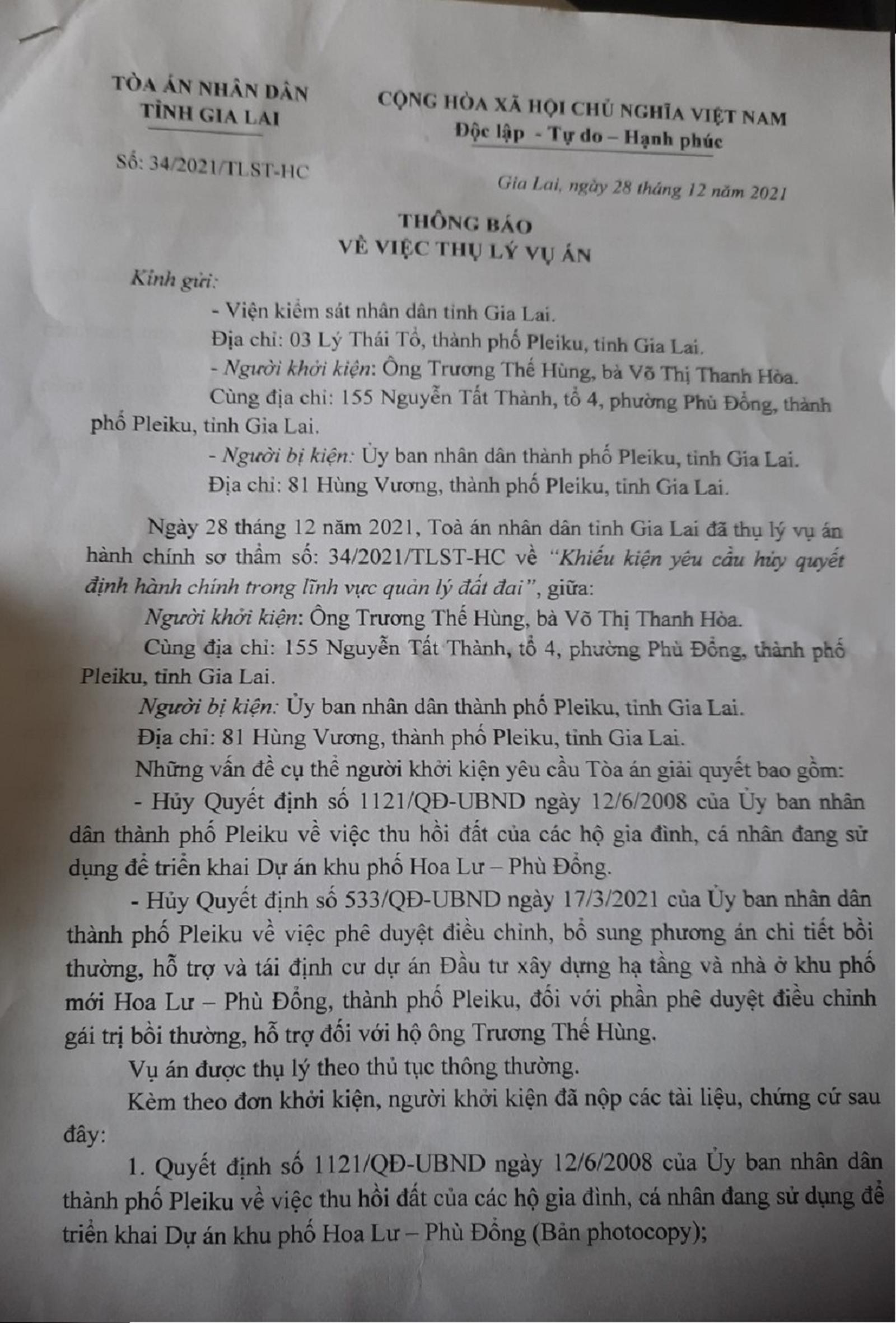Sau nhiều năm liền khiếu nại không thành, gia đình ông Hùng đã khởi kiện hành chính quyết định của UBND TP Peliku ra TAND tỉnh Giai Lai và toà cũng đã có Thông báo số 34/2021/TLST-HC ngày 28/12/2021 thụ lý vụ án.