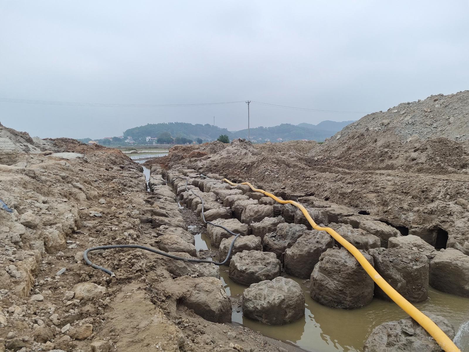 Thế nhưng, việc khơi thông dòng chảy gặp khó khăn do khi bới đất lên vướng các cọc bê tông đất nên dòng chảy rất nhỏ. UBND xã phải huy động người dân dùng cuốc, xẻng lách vào các cọc để vào đất lên, đồng thời bơm xối cát ở phía dưới cọc để việc thoát nước được nhanh hơn.