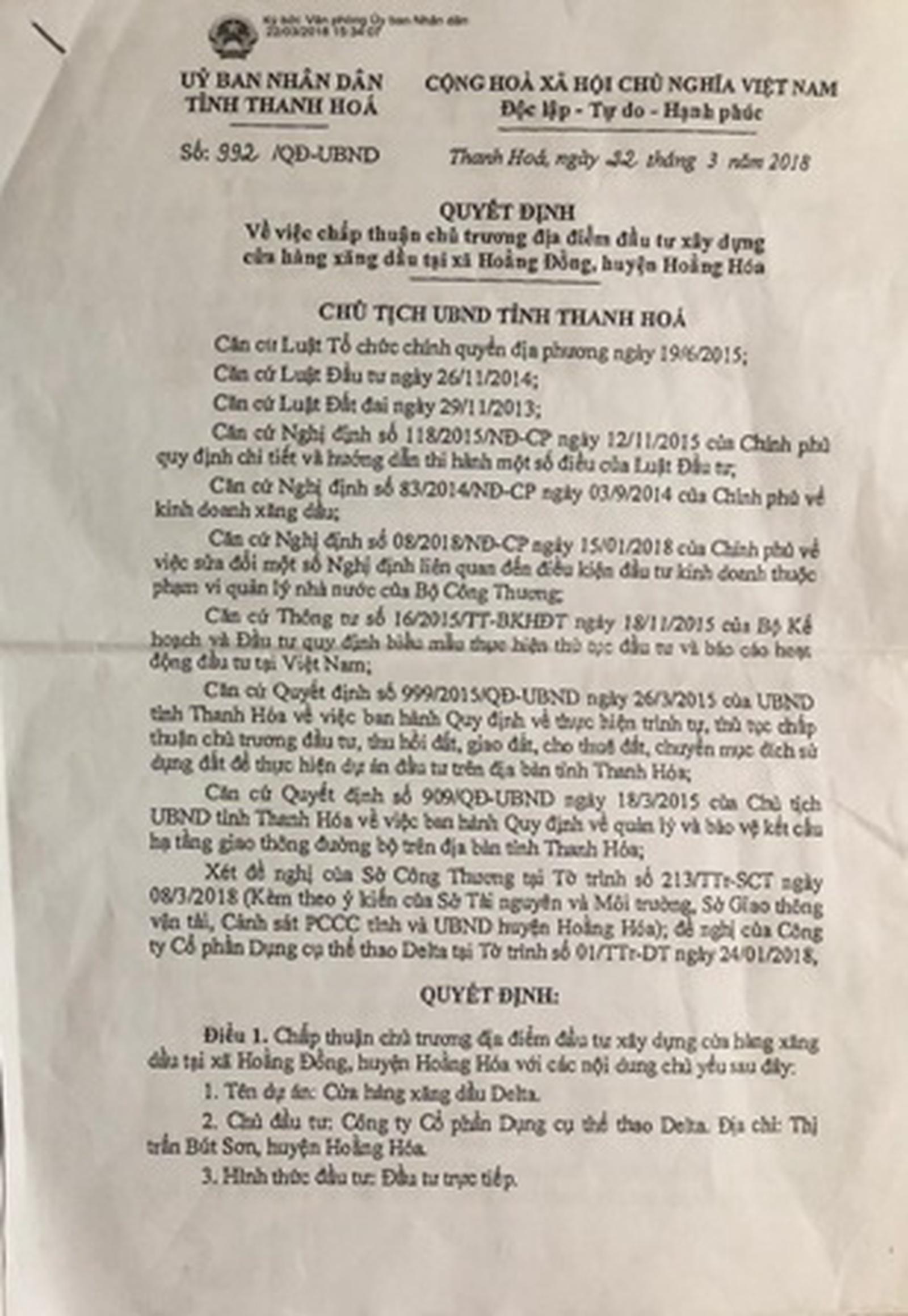 Quyết định 992 của UBND tỉnh "hợp pháp hóa” cây xăng của Cty Delta. Ảnh: PV