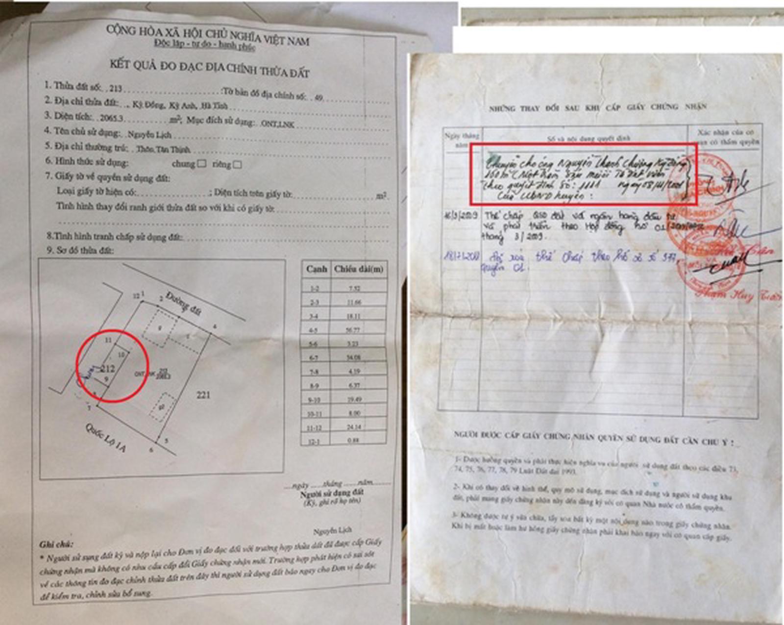 Trở về thời điểm trước, ngày 29/11/2014, vợ chồng ông Nguyễn Lịch và bà Đinh Thị Lý ký vào hồ sơ để xin cấp đổi lại GCNQSDĐ cấp ngày 21/2/1998. Thông tin thửa đất được đo đạc lại bản đồ địa chính như sau: Thửa đất số 213, tờ bản đồ số 49, diện tích 2.065,3m2, diện tích đất ở là 200m2, đất vườn 1.865,3m2, địa chỉ thửa đất thuộc thôn Đồng Phú, xã Kỳ Đồng, huyện Kỳ Anh. Và, UBND xã Kỳ Đồng xác nhận: “Đất sử dụng ổn định, ranh giới không thay đổi, không tranh chấp lấn chiếm, phù hợp với QSDĐ”. Cán bộ địa chính Trần Thị Thu Hương ký xác nhận ngày 20/10/2014 và Chủ tịch UBND xã Kỳ Đồng, ông Võ Ngọc Thương ký xác nhận ngày 29/11/2014.