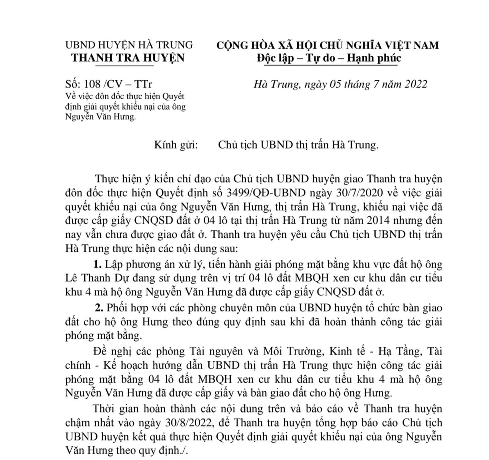 Ngày 5/7/2022, Chánh Thanh tra huyện Hà Trung đã có Công văn số 108/CV-TTr gửi Chủ tịch UBND thị trấn Hà Trung, nội dung cho biết: Thực hiện ý kiến chỉ đạo của Chủ tịch UBND huyện giao Thanh tra huyện đôn đốc thực hiện Quyết định số 3499/QĐ-UBND ngày 30/7/2022 về việc giải quyết khiếu nại của gia đình bà Phạm Thị Quế, Thanh tra huyện yêu cầu Chủ tịch UBND thị trấn Hà Trung lập phương án xử lý, tiến hành GPMB khu vực đất hộ ông Lê Thanh Dự đang sử dụng trên vị trí 4 lô đất xe cư tại tiểu khu 4, thị trấn Hà Trung mà gia đình bà Phạm Thị Quế đã được cấp GCNQSDĐ. Đồng thời, phối hợp với các phòng, ban chuyên môn của UBND huyện tổ chức bàn giao đất cho hộ ông Hưng theo đúng quy định sau khi đã hoàn thành công tác GPMB.