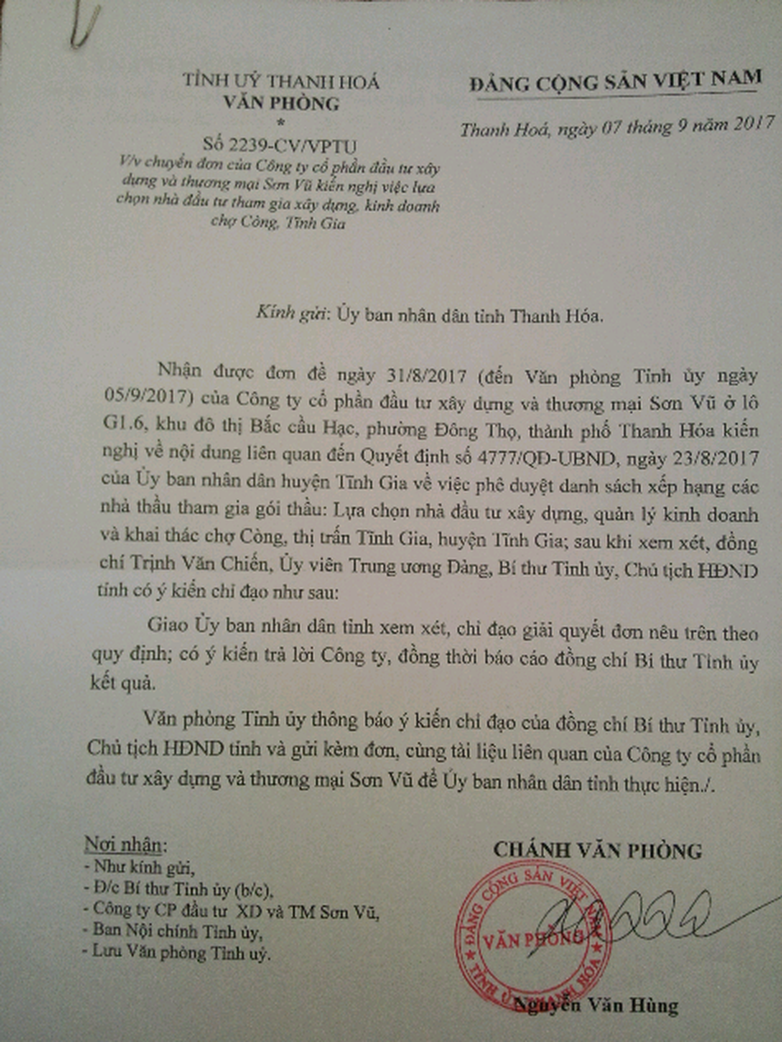 Sau khi Báo phản ánh, cùng với kiến nghị của doanh nghiệp, ngày 7/9/2017, Văn phòng Tỉnh ủy Thanh Hóa đã ra Văn bản số 2239-CV/VPTU với nội dung: Sau khi xem xét đơn thư kiến nghị của doanh nghiệp, Bí thư Tỉnh ủy Thanh Hóa Trịnh Văn Chiến có ý kiến chỉ đạo, giao UBND tỉnh xem xét, chỉ đạo giải quyết đơn thư nêu trên theo quy định, có ý kiến trả lời doanh nghiệp, đồng thời báo cáo Bí thư Tỉnh ủy.