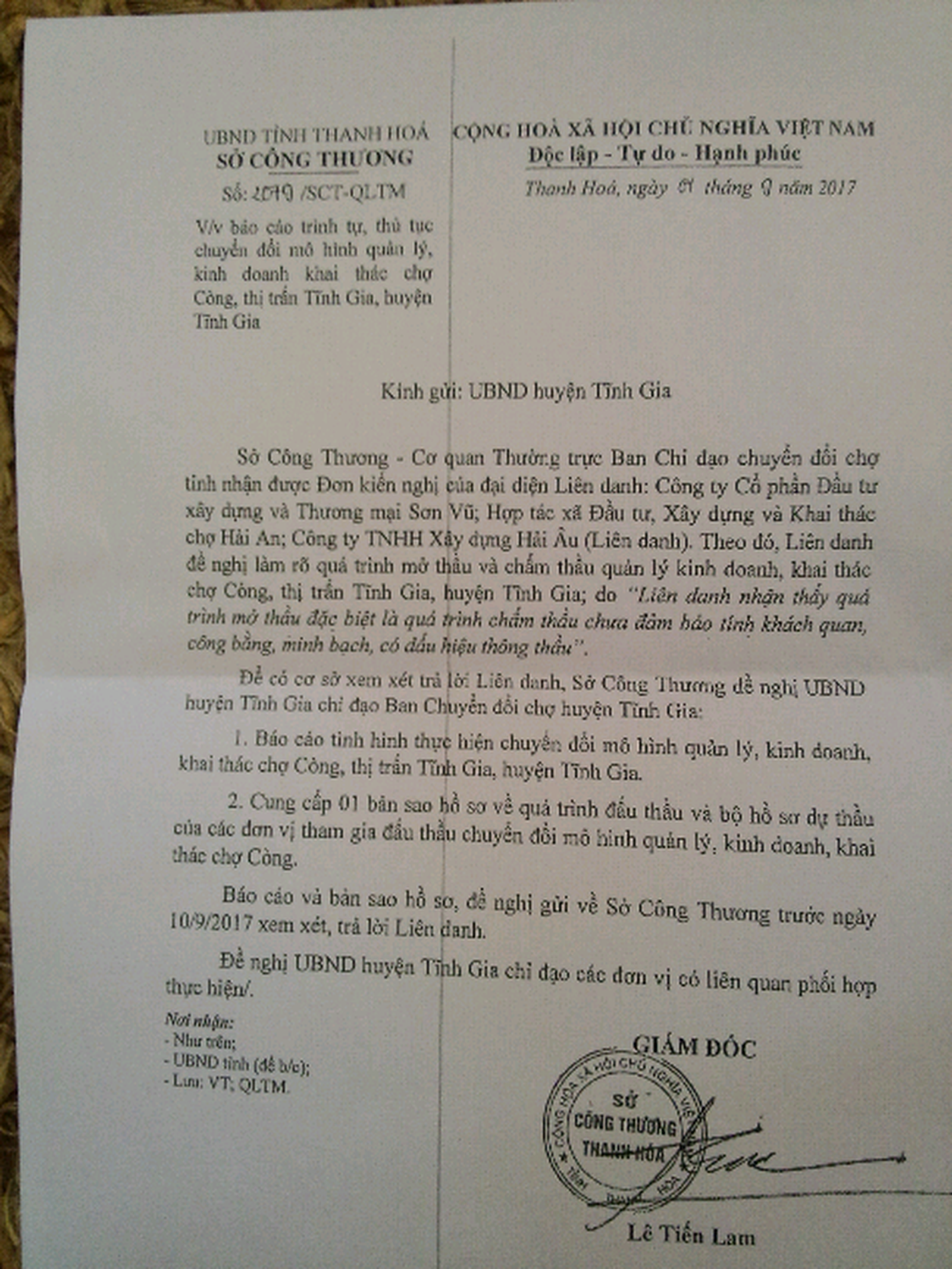 Để có cơ sở xem xét trả lời liên danh, Sở Công thương đã đề nghị UBND huyện Tĩnh gia chỉ đạo Ban chuyển đổi chợ huyện Tĩnh Gia báo cáo tình hình thực hiện chuyển đổi mô hình quản lý, kinh doanh khai thác chợ Còng; cung cấp bản sao hồ sơ về quá trình đấu thầu và bộ hồ sơ dự thầu của các đơn vị liên quan tham gia đấu thầu chuyển đổi mô hình chợ Còng; báo cáo và bản sao hồ sơ gửi về Sở Công thương trước ngày 10/9/2017 để xem xét, trả lời liên danh.