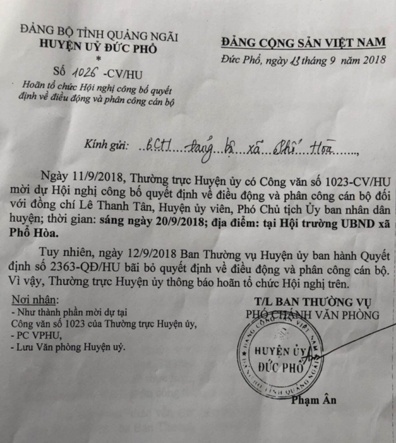Song, chỉ 3 ngày sau đó (13/9), Văn phòng Huyện ủy Đức Phổ có Công văn số 1026/CV-HU với nội dung: “Hoãn tổ chức hội nghị công bố quyết định về điều động và phân công cán bộ”. Lý do là ngày 12/9, Ban Thường vụ Huyện ủy ban hành Quyết định số 2363/QĐ-HU bãi bỏ quyết định về điều động và phân công cán bộ đối với ông Tân.