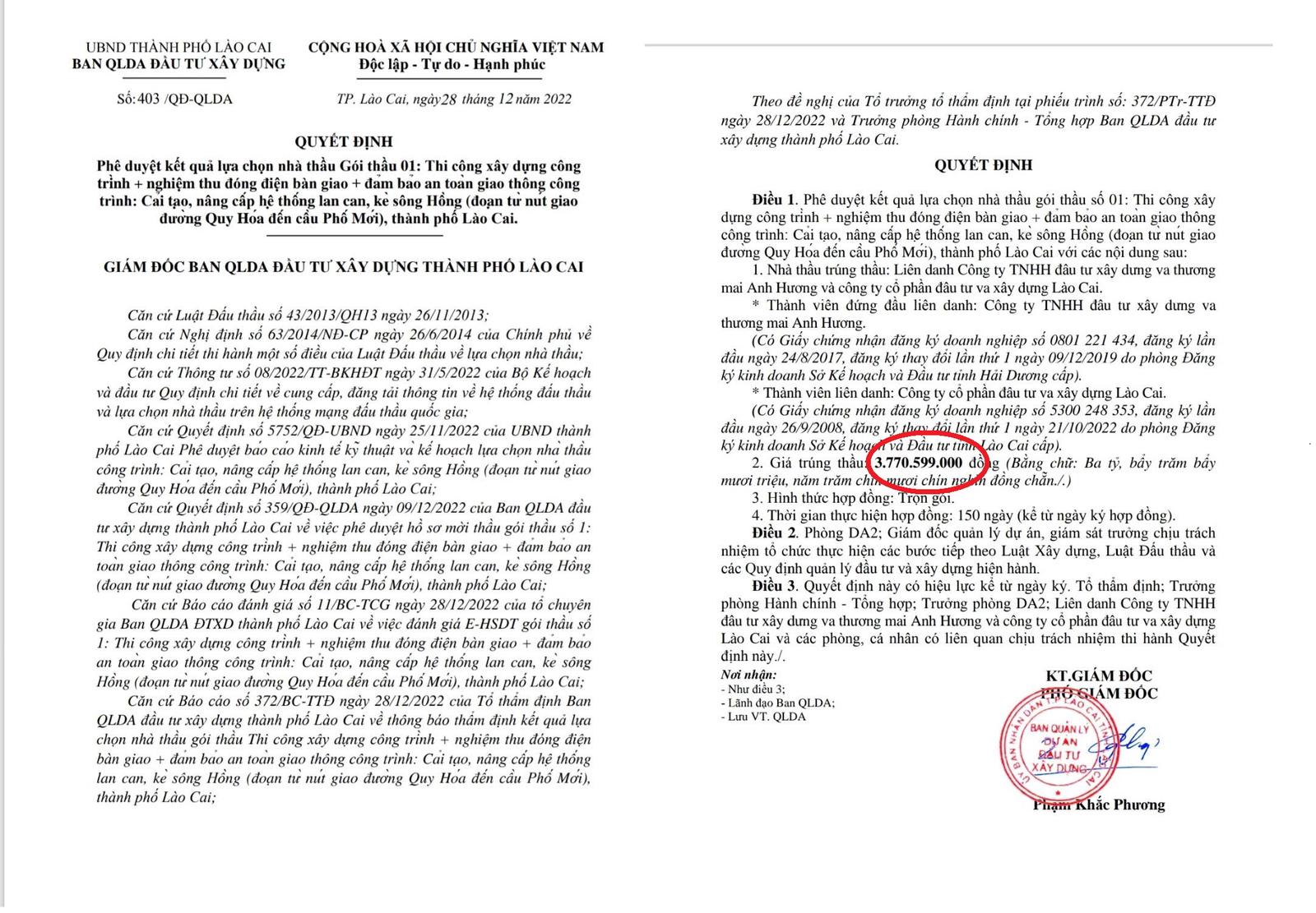 Khu vực thay thế hệ thống lan can kè sông Hồng, đường An Dương Vương (đoạn từ cầu Cốc Lếu đến cầu Phố Mới), TP Lào Cai có 2 dự án do ông Vũ Tuấn Anh - viên chức Ban QLDA TP Lào Cai được giao nhiệm vụ Giám đốc QLDA và giám sát trưởng công trình gồm: Dự án thay thế hệ thống lan can kè sông Hồng, đường An Dương Vương (đoạn từ cầu Cốc Lếu đến cầu Phố Mới), TP Lào Cai; dự án cải tạo, nâng cấp hệ thống lan can kè sông Hồng (đoạn từ nút giao đường Quy Hóa đến cầu Phố Mới, TP Lào Cai).
