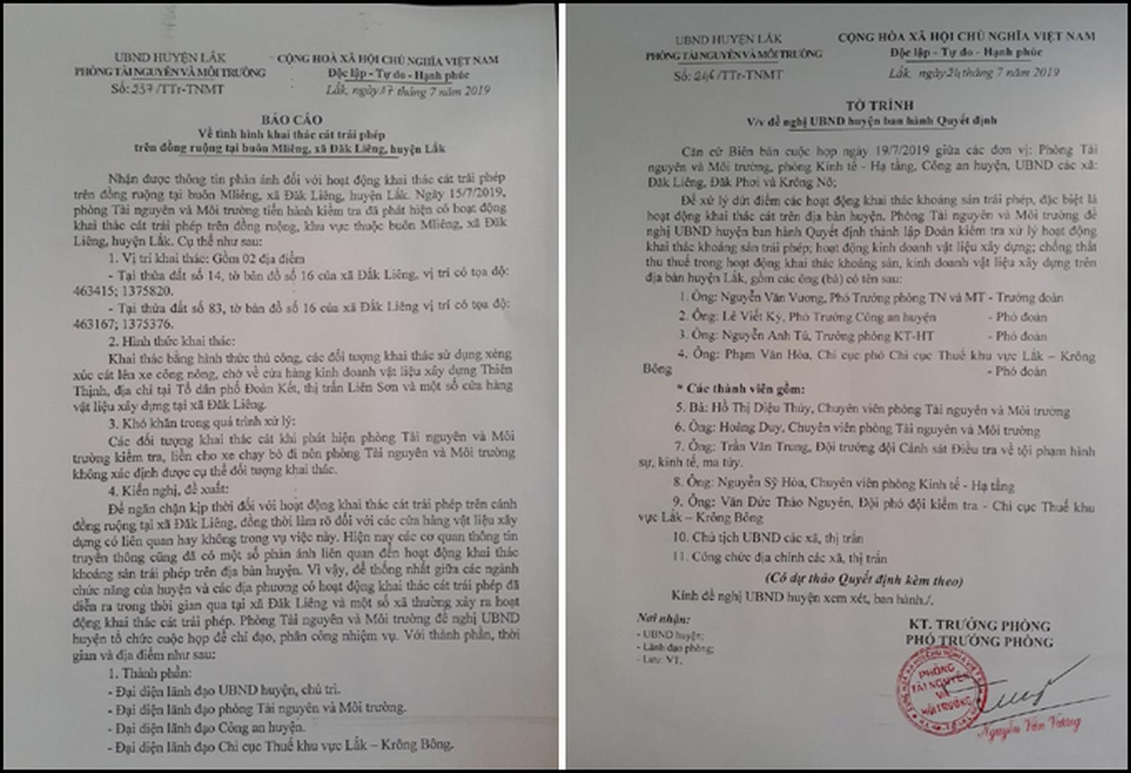 Báo cáo của Phòng TN&MT huyện Lắk về tình trạng khai thác cát trái phép trên địa bàn. Ảnh: Tr. Thọ