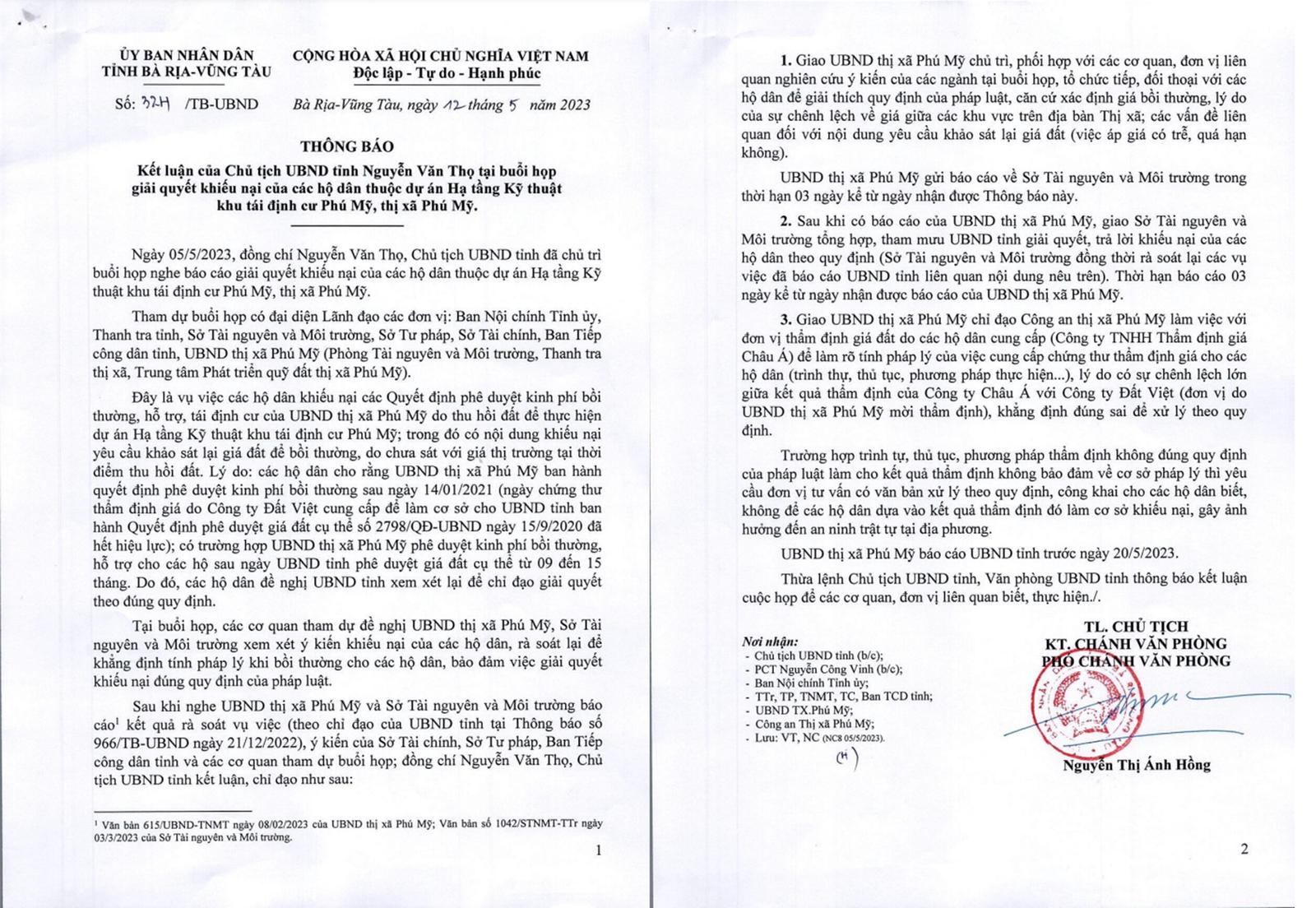 UBND tỉnh Bà Rịa - Vũng Tàu ban hành Công văn số 324/TB-UBND ngày 12/5/2023 về việc giải quyết khiếu nại của các hộ dân thuộc Dự án Hạ tầng Kỹ thuật khu tái định cư Phú Mỹ.