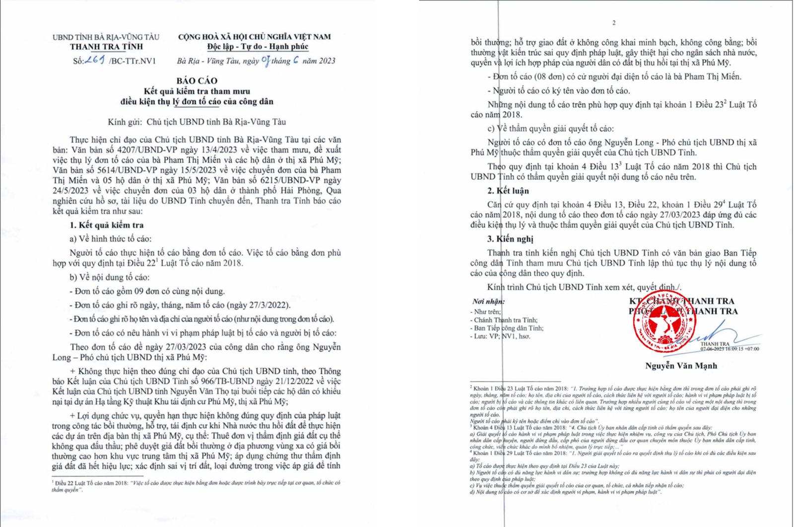 Ngày 7/6/2023, Thanh tra tỉnh có Báo cáo số 269/BC-TTr.NV1, kết luận nội dung tố cáo ngày 27/3/2023 của 9 hộ dân đáp ứng đủ các điều kiện thụ lý theo quy định tại khoản 4, Điều 13, Điều 22, khoản 1, Điều 29 Luật Tố cáo năm 2018 và thuộc thẩm quyền giải quyết của Chủ tịch UBND tỉnh.