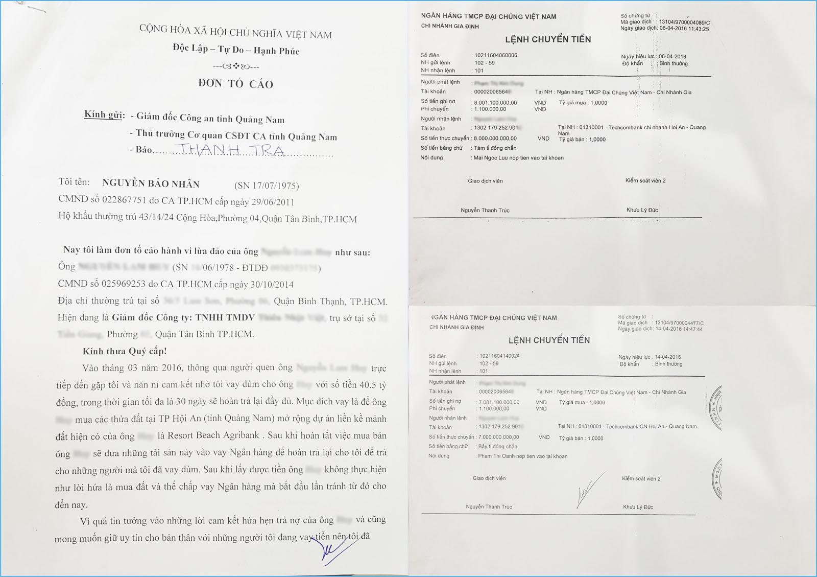 Nội dung đơn của ông Nguyễn Bảo Nhân phản ánh: “Vào tháng 3 năm 2016, thông qua người quen ông Nguyễn Lam H. trực tiếp đến gặp tôi và năn nỉ cam kết nhờ tôi vay dùm cho ông H. với số tiền 40,5 tỷ đồng, trong thời gian tối đa là 30 ngày sẽ hoàn trả lại đầy đủ. Mục đích vay là để ông H. mua các thửa đất tại TP Hội An, tỉnh Quảng Nam để mở rộng dự án liền kề khách sạn hiện có của ông H. Sau khi hoàn tất việc mua bán ông H. sẽ đưa những tài sản này vào vay ngân hàng để hoàn trả lại cho tôi để trả cho những người mà tôi đã vay dùm”.