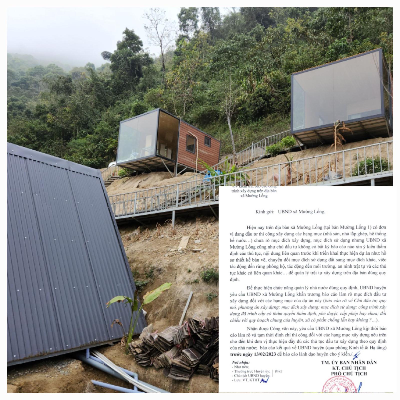 “Hiện nay trên địa bàn xã Mường Lống có đơn vị đang đầu tư thi công xây dựng các hạng mục (nhà sàn, nhà lắp ghép, hệ thống bể nước...) chưa rõ mục đích xây dựng, mục đích sử dụng nhưng UBND xã Mường Lống cũng như chủ đầu tư không có bất kỳ báo cáo nào xin ý kiến thẩm định các thủ tục, nội dung liên quan trước khi triển khai thực hiện như: Hồ sơ thiết kế bản vẽ, chuyển đổi mục đích sử dụng đất sang mục đích khác, việc tác động đến rừng phòng hộ, tác động đến môi trường, an ninh trật tự và các thủ tục khác có liên quan khác… để quản lý trật tự xây dựng trên địa bàn đúng quy định”, văn bản UBND huyện chỉ đạo xã Mường Lống, đồng thời yêu cầu UBND xã tạm đình chỉ thi công đối với các hạng mục xây dựng.