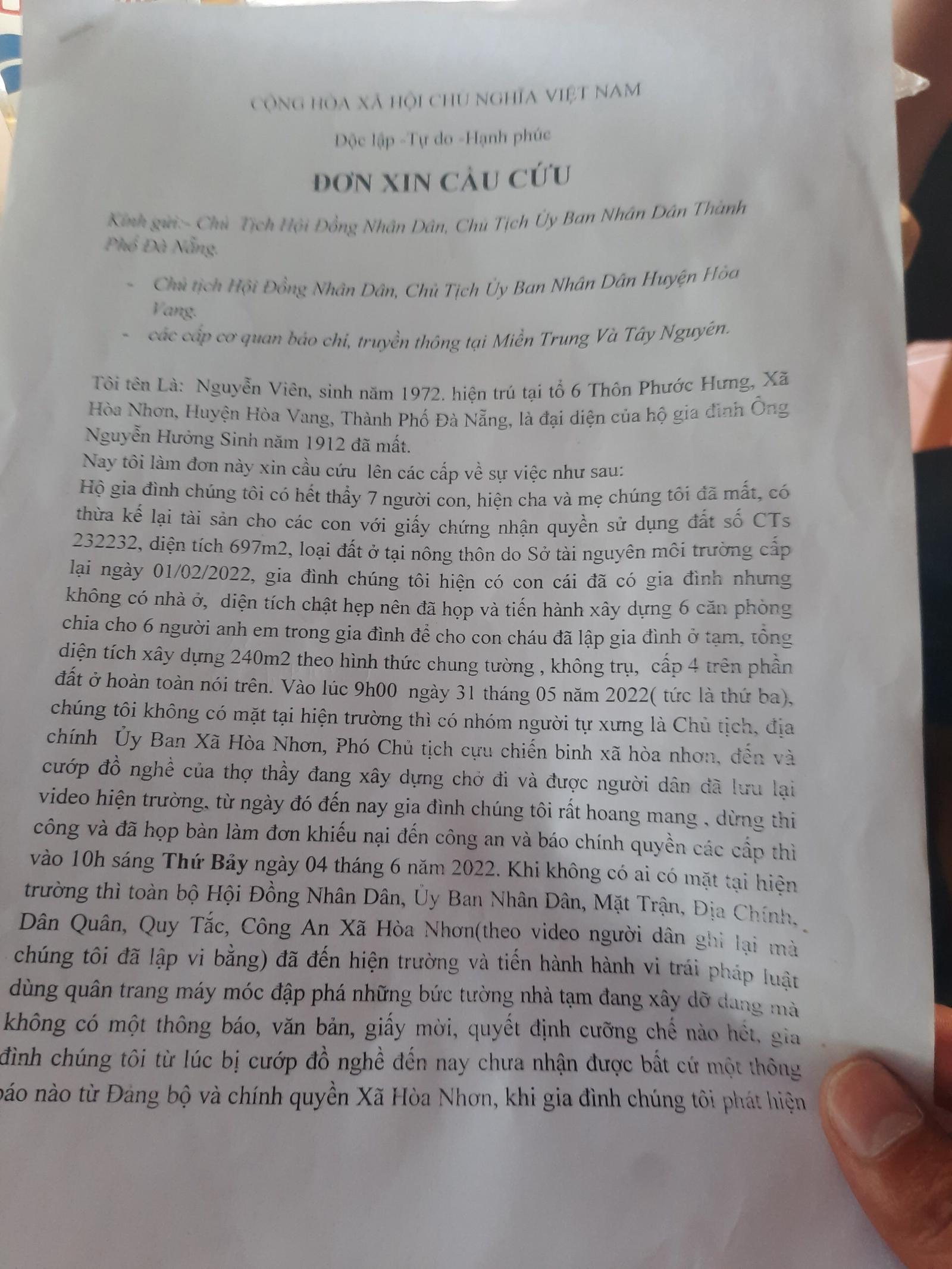 Trước đó, ông Nguyễn Viên (trú tổ 6, thôn Phước Hưng, xã Hòa Nhơn, huyện Hòa Vang, Đà Nẵng) đại diện hộ gia đình vừa có đơn cầu cứu gửi lãnh đạo các cơ quan chức năng của TP, huyện Hòa Vang và các cơ quan báo chí, nêu việc ông Trần Văn Thu, Chủ tịch UBND xã Hòa Nhơn chỉ đạo cán bộ xã cưỡng chế, đập phá công trình đang xây dựng của gia đình sai quy trình, quy định của pháp luật.