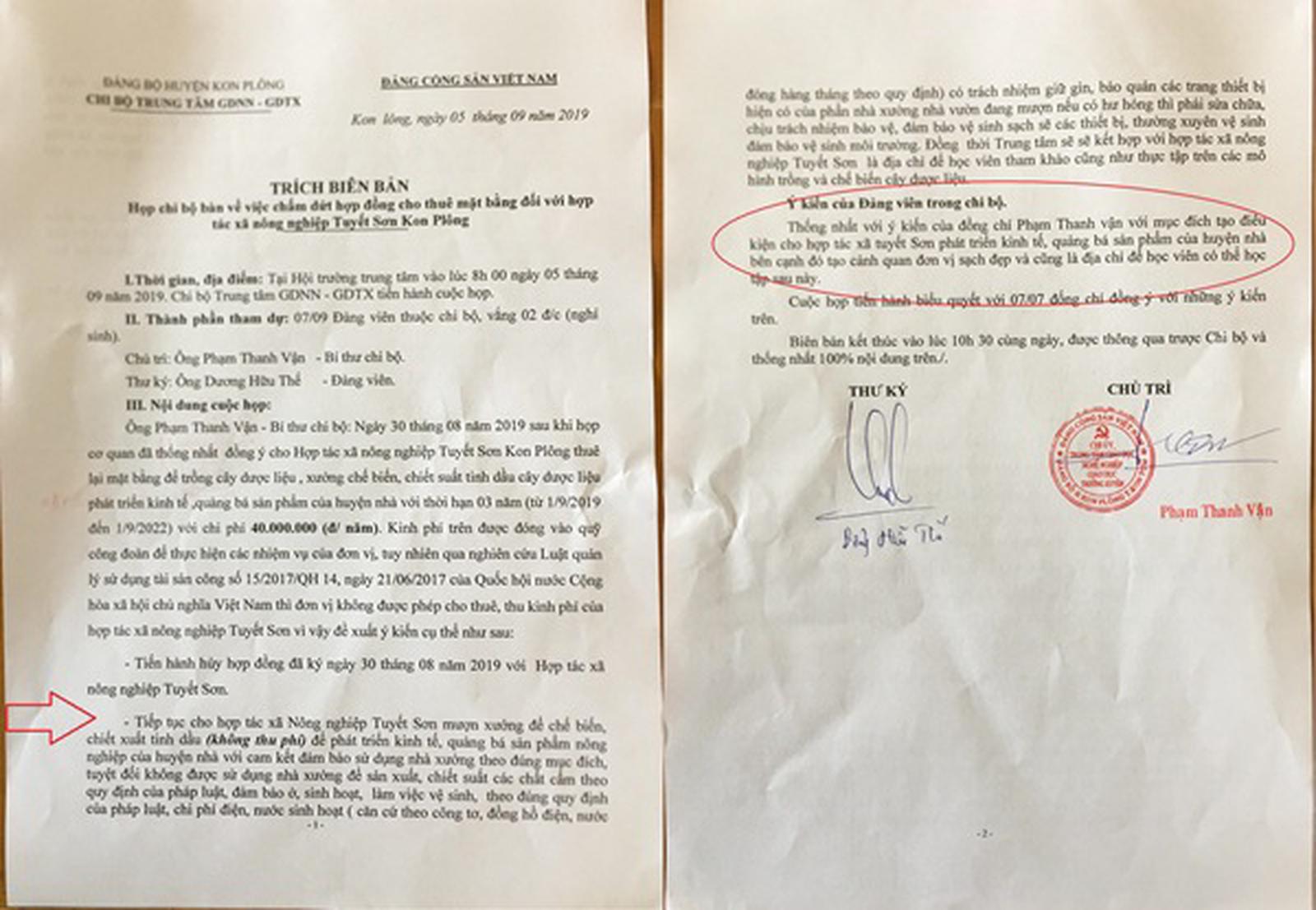 Như vậy, ông Vận là người tự ý ký hợp đồng đem tài sản của Nhà nước cho doanh nghiệp thuê, rồi lại hủy hợp đồng mà không hề thông qua UBND huyện Kon Plong. Và cũng chính ông Vận sau khi hủy hợp đồng với HTX nông nghiệp Tuyết Sơn lại tự ký quyết định cho doanh nghiệp này mượn mặt bằng của trung tâm để chế biến, chiết xuất tinh dầu với mục đích là: “Quảng bá sản phẩm nông nghiệp, nhằm phát triển kinh tế cho huyện nhà”.