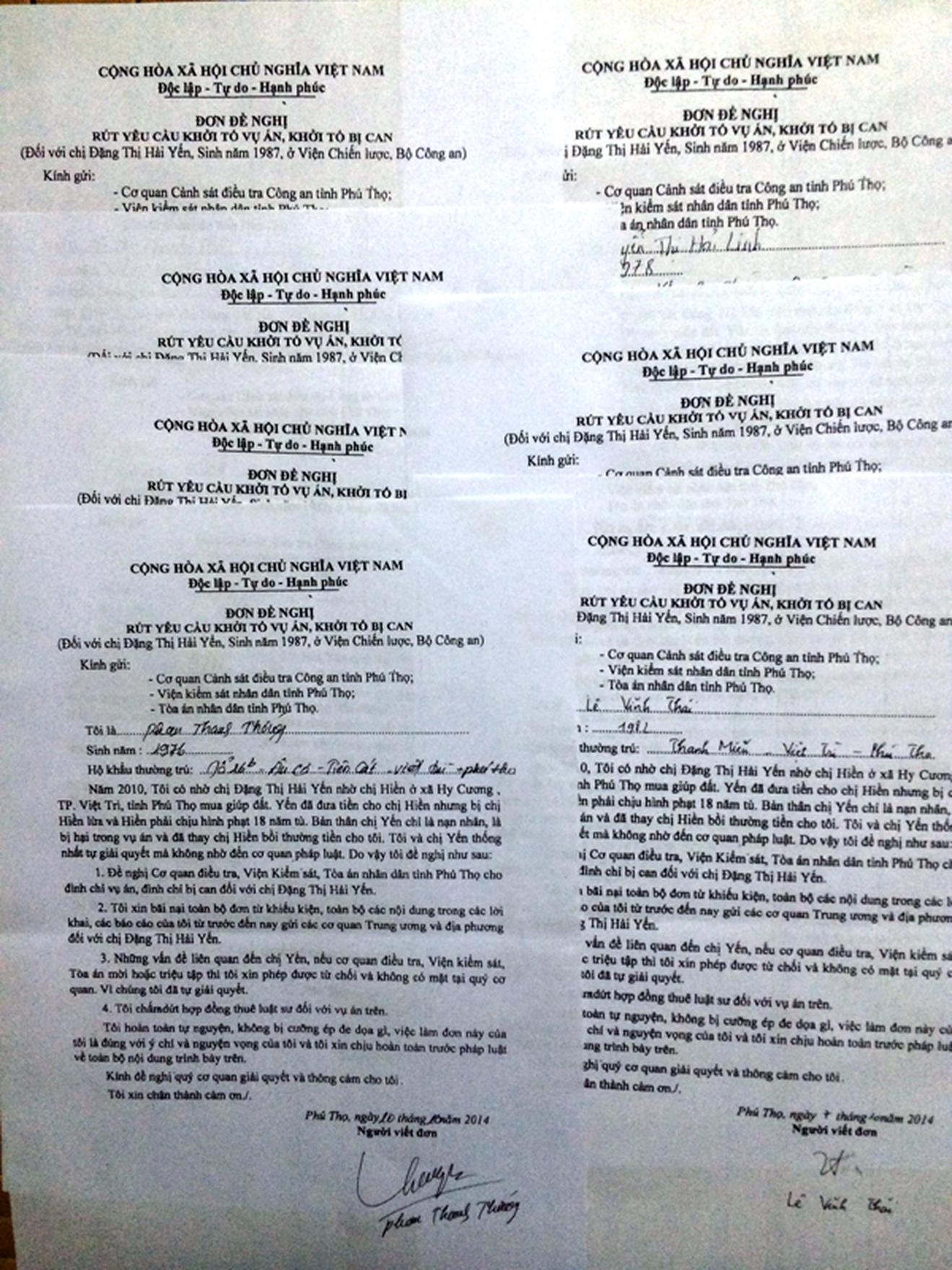 Trong “Đơn đề nghị rút yêu cầu khởi tố vụ án, khởi tố bị can”, anh Phan Thanh Thống (cư trú tại tổ 26B, phố Âu Cơ, phường Tiên Cát, TP Việt Trì, tỉnh Phú Thọ), một trong những người đưa tiền để nhờ chị Yến mua giúp đất đã viết: “Năm 2010, tôi có nhờ chị Đặng Thị Hải Yến nhờ chị Hiền ở xã Hy Cương, TP Việt Trì, tỉnh Phú Thọ mua giúp đất. Yến đã đưa tiền cho chị Hiền nhưng bị chị Hiền lừa và Hiền phải chịu hình phạt 18 năm tù. Bản thân chị Yến chỉ là nạn nhân, là bị hại trong vụ án và đã thay chị Hiền bồi thường tiền cho tôi. Tôi và chị Yến thống nhất tự giải quyết mà không nhờ đến cơ quan pháp luật. Do vậy, tôi có đề nghị cơ quan điều tra, viện kiểm sát, TAND tỉnh Phú Thọ đình chỉ vụ án, đình chỉ bị can đối với chị Đặng Thị Hải Yến. Những vấn đề liên quan đến chị Yến, nếu cơ quan điều tra, viện kiểm sát, tòa án mời hoặc triệu tập thì tôi xin phép được từ chối và không có mặt tại quý cơ quan. Vì chúng tôi đã tự giải quyết”.