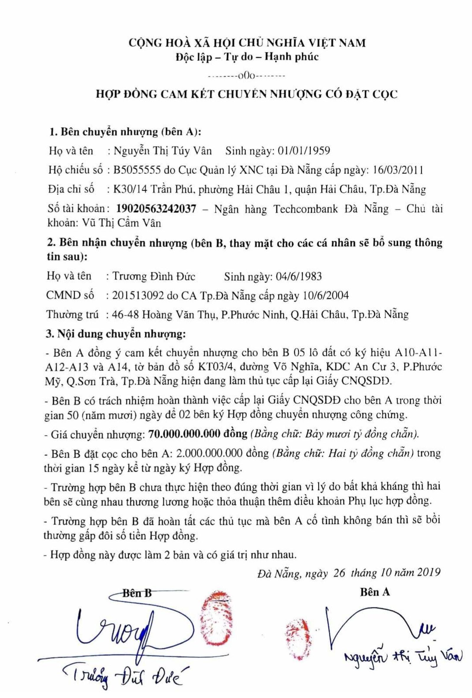 Theo nội dung vụ kiện: Ngày 26/10/2019, bà Túy Vân ký “hợp đồng cam kết chuyển nhượng có đặt cọc” 5 lô đất cho ông Đức. Các lô đất mang ký hiệu AP 114734, AP 114735, AP 114736, AP 114737 và AP 114742, nằm tại đường Võ Nghĩa, Khu dân cư An Cư 3, phường Phước Mỹ, quận Sơn Trà, Đà Nẵng, với giá 70 tỷ đồng.