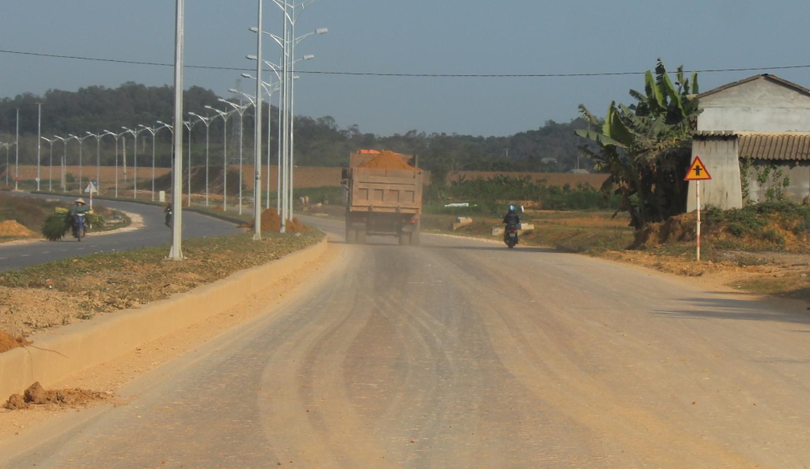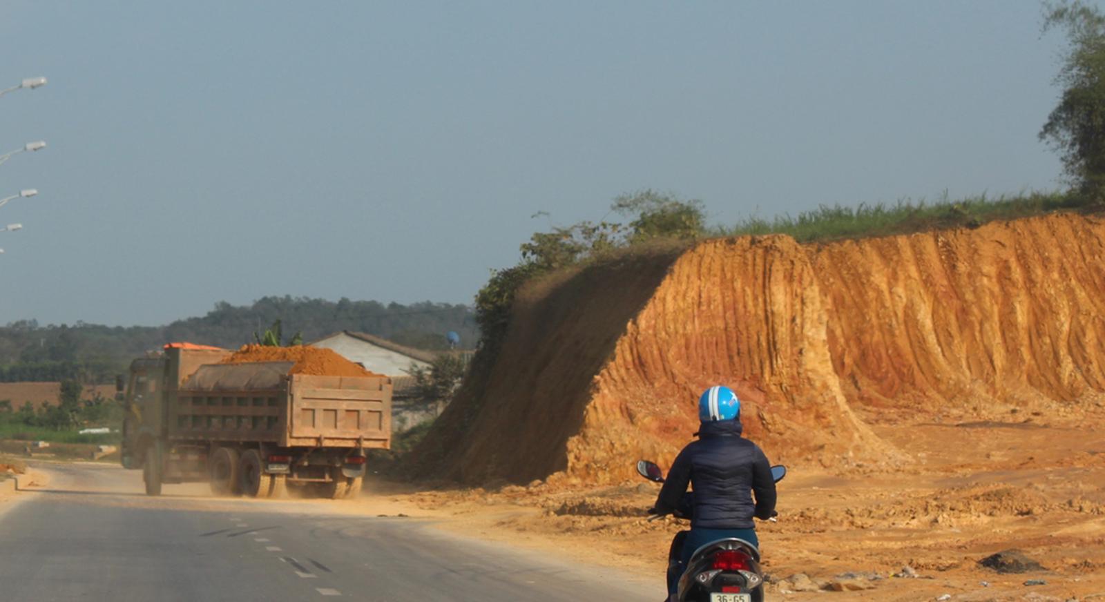 Theo phản ánh của người dân, chúng tôi tìm về thôn Đồng Cốc, xã Xuân Phú. Ngay cạnh tuyến đường vừa được Nhà nước đầu tư hàng trăm tỷ đồng còn chưa được bàn giao, nghiệm thu, hàng chục chiếc xe đang thi nhau vận chuyển đất đưa đi các nơi tiêu thụ, bụi bay mù mịt, ô nhiễm môi trường không khí nghiêm trọng.