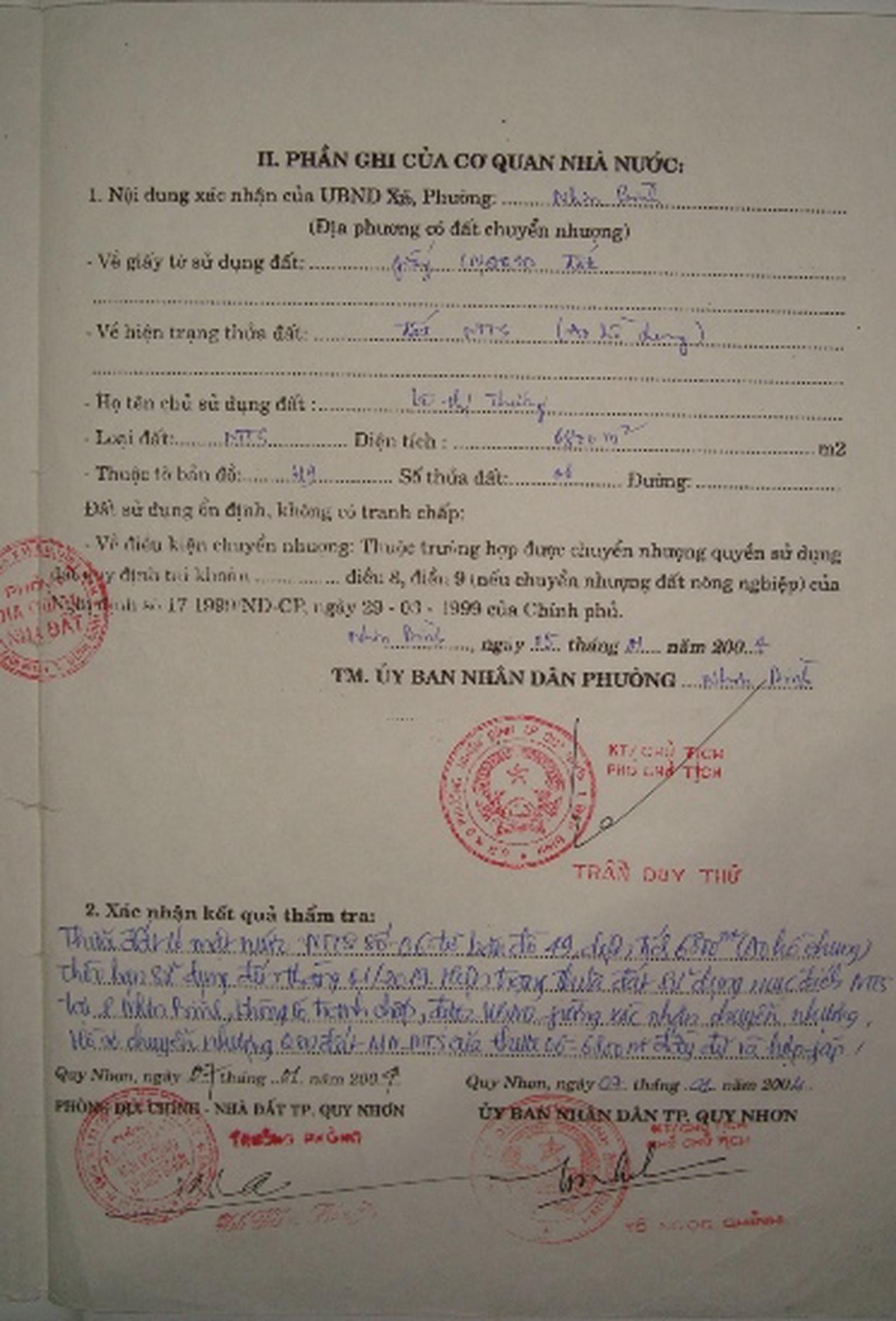 Việc mua bán, chuyển nhượng đều được thực hiện công khai và tuân thủ theo sự hướng dẫn của UBND phường Nhơn Bình và UBND TP Quy Nhơn. Sau khi xác minh cụ thể, UBND TP Quy Nhơn đã cấp GCNQSDĐ số 01373 QSDĐ/617/QĐ-UB, cấp ngày 07/01/2004. Gia đình ông Bá được Nhà nước cấp QSDĐ từ ngày 01/01/2004 đến tháng 01/2019. Phía gia đình bà Thương ký và nhận tiền đầy đủ của gia đình ông Bá.