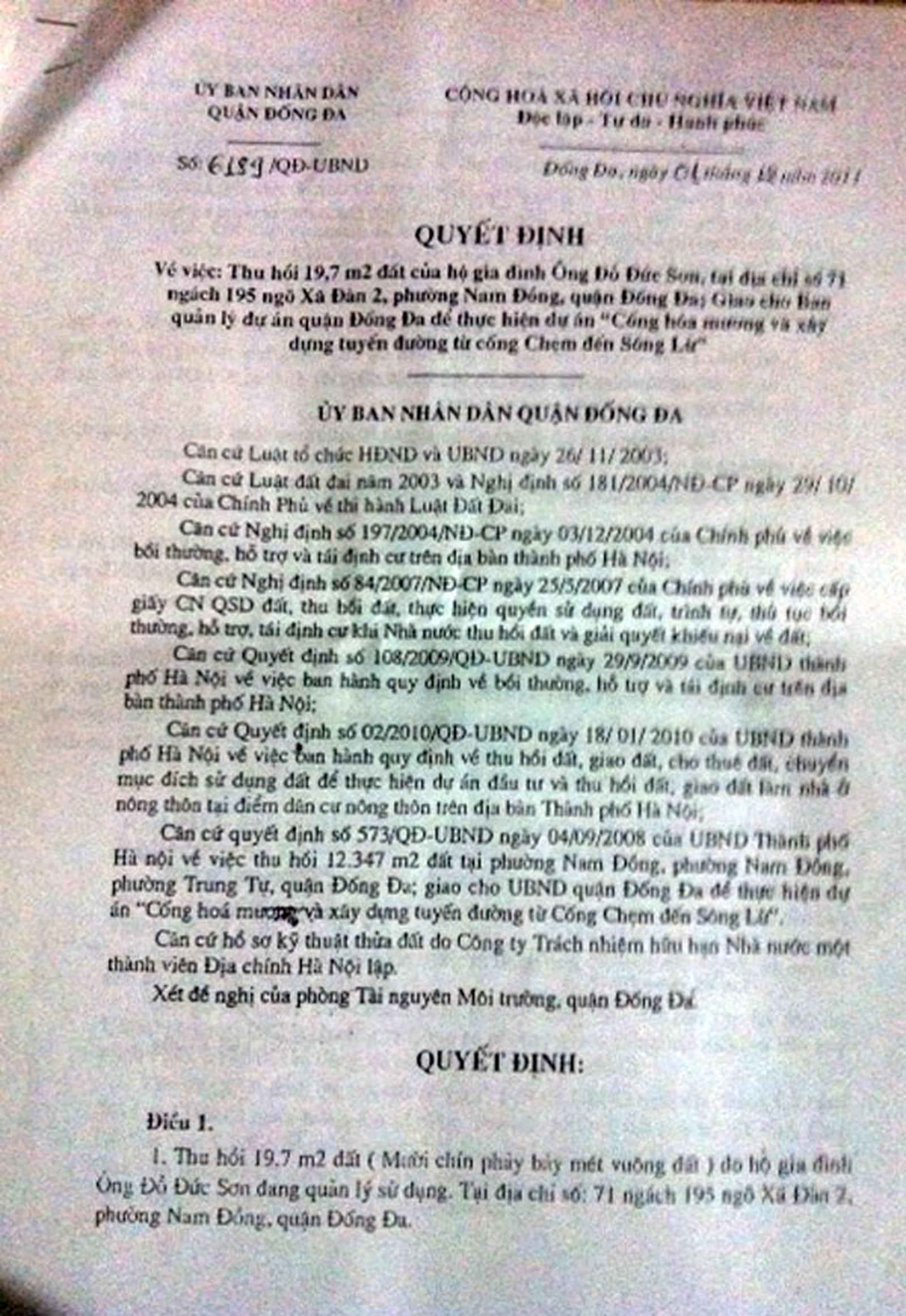 Ngày 1/12/2011, Phó Chủ tịch UBND quận Đống Đa Trần Việt Trung ký ban hành Quyết định số 6189/QĐ-UBND về việc thu hồi 19,7m2 đất của gia đình ông Đỗ Đức Sơn, tại địa chỉ số 71, ngách 195, ngõ Xã Đàn 2, phường Nam Đồng (nay là 163 phố Xã Đàn) để giao cho Ban Quản lý D.A quận Đống Đa thực hiện D.A. Theo đó, thu hồi 19,7m2 đất do hộ gia đình ông Đỗ Đức Sơn đang quản lý sử dụng tại địa chỉ số 71, ngách 195, ngõ Xã Đàn 2. Vị trí, diện tích, ranh giới thu hồi đất được xác định bởi các điểm (A, C) thuộc thửa đất số 6 do Công ty TNHH Nhà nước MTV Địa chính Hà Nội lập ngày 1/12/2010 có xác nhận của UBND phường Nam Đồng, Ban Quản lý D.A quận Đống Đa và chủ sử dụng đất (SDĐ).